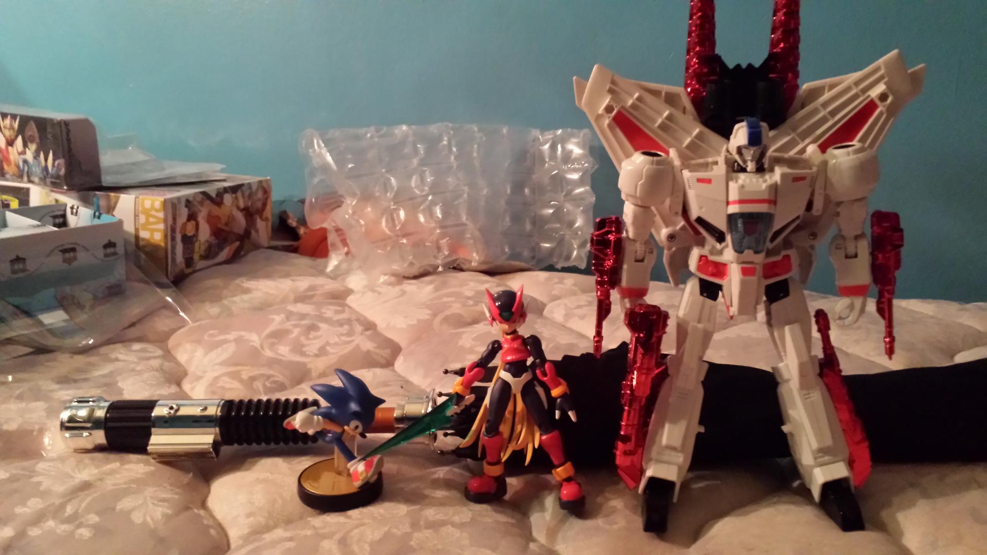 http://www.tokunation.com/attachment...1&d=1423289728 Obi-Wan Lightsaber Umbrella, SHF Mega Man Zero Zero, Sonic Amiibo, and Leader Jetfire. (Sonic and Umbrella came in today.) |