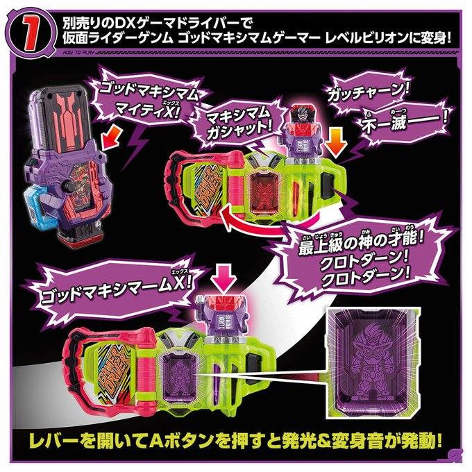 "Instead of “Level Max!” it says “Immortal!” (不滅! / Fumetsu) Standby: 最上級の神の才能!クロトダーン!クロトダーン! Saijōkyū no kami no sainō! Kuroto Dān! Kuroto Dān! The biggest and godliest intellect! KUROTO DAAAN, KUROTO DAAAN~! Transformation: ゴッドマキシマームX! Goddo Makishimāmu Ekkusu! God Maximum… X~! And the finisher is God Maximum Critial Blessing. Yes, really." Source:http://gameridernews.tumblr.com/post...dai-goodie-for |