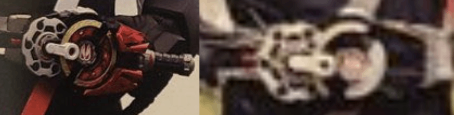 My main take away here is that in the shot of the blank form you can see the bike handle piece is not attached at all, fully confirming it is removable, presumably meaning it will be another modular part (Oh also the number 666 is in the text? Though I'm assuming that's a reference to battle familia?) Okay looking through it a bit with google lens most of it is just Battle Familia cross promotion or text saying "more info on geat's weapons soon!" The only things of some notability or intrigue are: -under the blank form I think it says smth along the lines of "a blank form onto which various pieces of armour may be added" -the text at the bottom is just like "He looks like a fox" but then goes "And what type of enemy is Geats fighting...!?" everything else is a bit nothing tbh as far as I can tell Oh also the right side (our left) gimmick item is way thinner than I thought it was??? unless it's the "thin" prop version... I know revice had like thin vistamp props for some things |