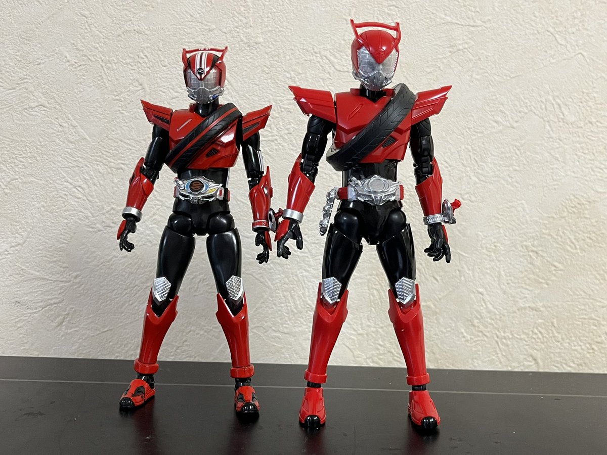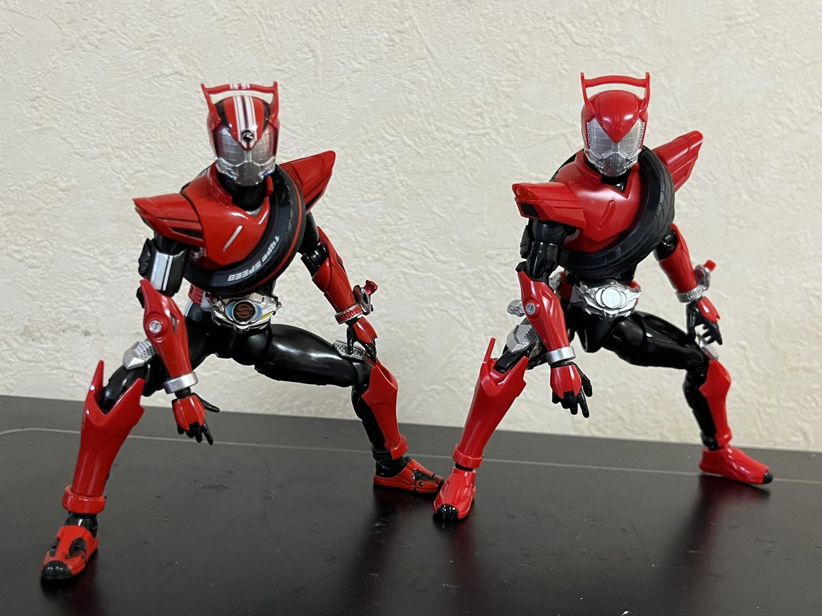 SHF Drive versus Unstickered FRS. A little faint to see, but the emblem on the helmet is sculpted in