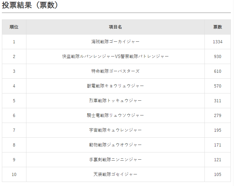 I'm surprised Go-Busters is all the way up at #3! I'm not surprised Gokaiger is at #1 with twice as many votes as Go-Busters!
