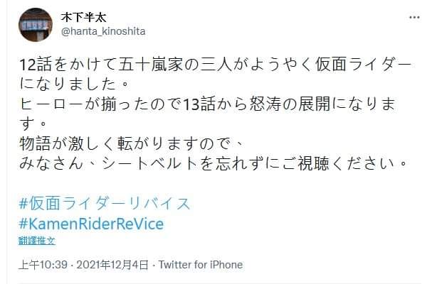 http://www.tokunation.com/attachment...1&d=1638613692 After 12 episodes were aired, the three members of the Igarashi family finally became Kamen Riders. Since all the heroes are available, it will be a rage from episode 13. The story will rolls violently, so don't forget to watch your seat belts. Source Translation Source |