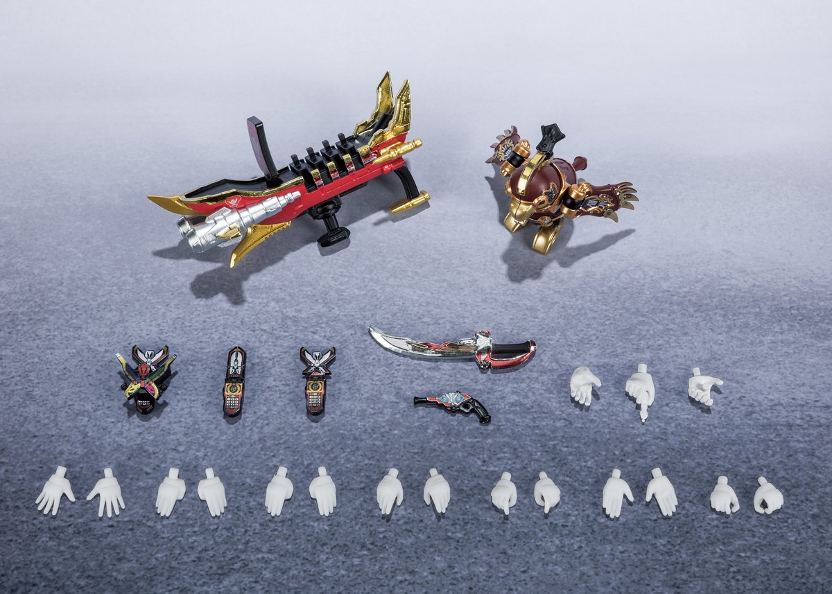 SHODO SUPER Gokaiger!! This is coming in two sets releasing and going up for pre-order simultaneously; with the base 5 Gokaigers in one set for 8250 Yen, and then a second set for 5500 yen containing Gokai Silver, his Gold Mode parts, and the Cross Armour parts from Ten Gokaiger! There's a bunch of extras included, most notably Mobirates with key-holding hands, the Gokai Galleon Buster and Navi!