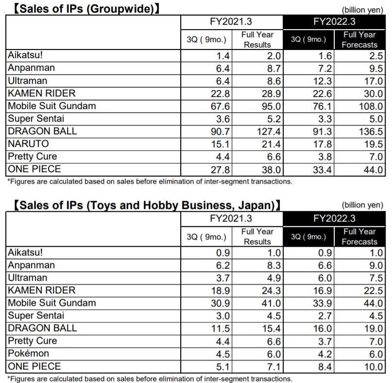 Bandai’s sales figures for the past year. Placed here because Ultraman was the big winner Tokusatsu wise (and the only one to have this year’s instalment outsell last years’)