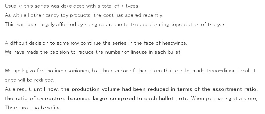 " Normally, this series consisted of seven types in total, but like all other candy toys, it has been greatly affected by the recent rise in costs and the acceleration of the depreciation of the yen. Despite the headwinds, we made the difficult decision to reduce the number of lineups in each release in order to somehow continue the series. We apologize to everyone for the fact that the number of characters that can be made into three-dimensional characters at one time will be reduced, but due to this , the ratio of characters whose production volume has been reduced due to the assortment ratio will increase compared to each bullet, etc. " |