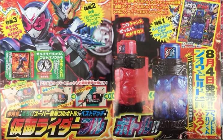 So in case you are wondering what these are, The red bottle is the Super Sentai Full Bottle, the blue one is the Kamen Rider Full Bottle. Super Sentai Full Bottle can be obtained by buying this particular issue of Televi-kun and Kamen Rider Full Bottle can be obtained by buying the Super Televi-kun Zi-O & Build issue. Inserting the Sentai bottle will give you the sound "Super Sentai!" Inserting the Kamen Rider bottle right after that will give you "Kamen Rider! Best match!" After the are you ready sound, it will say "Nichiasa saikou(Sunday morning is the best)! Super Hero Time! Yay!" For those still not unfamiliar Nichiasa is a shortened form of Nichiyobi Asa, which means Sunday morning, the time period sentai and rider shows air in Japan. |