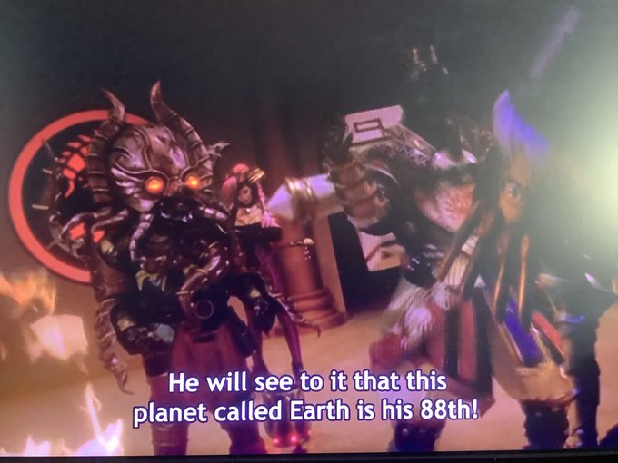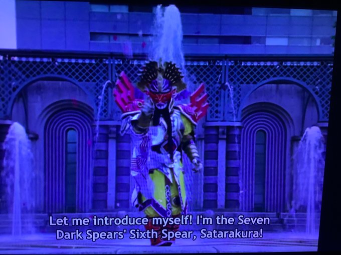This is another Arakawa episode. If you?ve been following this thread, you?ll know that I had a personal distaste for his previous contributions to Hurricaneger. Will he continue that streak, or will he impress me? Let?s find out. (Key: words in italics are in English) To start with, our titles have been updated to add Manmarva and Satarakura. https://pbs.twimg.com/media/EvQighSX...jpg&name=small https://pbs.twimg.com/media/EvQighSW...jpg&name=small We begin with Wendinu doing her makeup to look good in front of the Sixth Spear when he shows up. Furabijo on the other hand, is slightly sceptical about his character. https://pbs.twimg.com/media/EvQighkX...jpg&name=small Tau Zant assures her that he?s destroyed thousands of planets (the bad guys in Power Rangers SPD say the same thing about their monsters of the week, so that?s not very reassuring). Wendinu then notices Manmarva is gone. Sure enough, he?s in the city, walking through a crowd who are for reasons the episode doesn?t explain (I assume it?s to do with the cloak, since they start seeing him once he takes it off) can?t be seen by anyone. https://pbs.twimg.com/media/EvQigmVX...jpg&name=small We then see the Hurricanegers at the batting cage (From here to San Diego, talkin soooftball), on a feeling Nanami had (Its called foreshadowing). As they decide to invite the Kasumi Bros, Manmarva notes that they?re not here and move on. At a construction site where Ikkou and Isshu have found work, they sense something. https://pbs.twimg.com/media/EvQihj4X...jpg&name=small After some jackassery, Manmarva throws off his cloak so we can get a good look at his new bod. (And Ikkou and Isshu get a good look at his new look) https://pbs.twimg.com/media/EvQihiiX...jpg&name=small Manmarva identifies himself and announces that he?s going to make the duo pay for tricking him into thinking they were the other two Spears. A fight breaks out, but the Gouraigers are on the receiving end of a beatdown, which ends with Mamnmarva punching Ikkou so hard, the image of a scorpion briefly appears on his chest (if this whole being evil thing doesn?t pan out, he could always start a tattoo parlour). He then comments that the Grim Reaper is smiling on Ikkou before leaving. https://pbs.twimg.com/media/EvQihlNW...jpg&name=small Back at the Centipede, Sargain, Wendinu and Furabijo think the Sixth Spear is here? but it?s just Manmarva. But Manmarva then says that the Sixth Spear ?is? here. As everyone looks around, presents appear from nowhere, addressed to the universe?s cutest girl Furabijo, the universe?s greatest beauty Wendinu, the universe?s greatest genius Sargain and the universe?s greatest prophet Manmarva. https://pbs.twimg.com/media/EvQihq9W...jpg&name=small Furabijo, Wendinu and Sargain all open the gifts (Manmarva, like me, has seen what?s coming)? and all end up with pie in their faces (and Sargain opened his faceplate for this), much to the amusement of a newcomer in a silly outfit (and that?s saying something, because he already looks pretty flamboyant). https://pbs.twimg.com/media/EvQiiXBX...jpg&name=small https://pbs.twimg.com/media/EvQiiYZW...jpg&name=small The newcomer reveals that he set the whole thing up for ?Space Candid Camera?, and after showing a replay, addresses Tau Zant as ?Taza-yan? (yan being an old-fashioned honorific, similar to Isshu referring to his brother as ?Anija?), much to everyone?s shock. https://pbs.twimg.com/media/EvQiiZmX...jpg&name=small The newcomer then introduces himself (again, if you saw last week?s next time trailer) as the Seven Dark Spears? Sixth Spear, Satarakura (portmanteau of Saturday and Sakura (cherry blossoms)). https://pbs.twimg.com/media/EvQiicWX...jpg&name=small Satarakura then states that his MO is having fun while doing evil, chiding Manmarva for not opening his gift (maybe you shouldn?t have tried pulling a fast one on a guy who can see the future. Just saying), being a boring stiff. He then prepares his plan. https://pbs.twimg.com/media/EvQijOhX...jpg&name=small Elsewhere, the Kasumi Bros share their encounter with the Hurricanegers. As Yosuke is laughing about them losing to Manmarva (apparently, they left out the part where he isn?t a Floaty-Head anymore). Ikkou feels pain in his chest (it wasn?t that sick a burn. Man up) as scorpions emerge from his trousers (man, that?s an unsanitary construction site if they have scorpions) and Nanami and Kouta feel pain all of a sudden. It?s then that a new monster appears: Mirage Ninja Jin-Giron. https://pbs.twimg.com/media/EvQijRvX...jpg&name=small Hamster Headmaster wakes Oboro up from her nap to send the Shinobi Machines (well, it?s more in character than he was in episode 12). As Senpuujin attacks, Jin-Giron vanishes and they hit a building. Ikkou states hat he knew it was a mirage because he couldn?t sense its presence. Satarakura then laughs at the irony of heroes of justice destroying a building. After stating that he?s a new commander (Shin Kanpuu) rather than a new member (Shinkansen), along with some other puns, he states that the real Jin-Giron is going around turning people into exclamation marks by surprising them, with over 1500 victims so far (the specifics of how he does this are not explained). Once he has 10000 exclamation marks, he can use them to create a bomb that will eradicate all life on Earth (I thought he was all about fun. This just seems needlessly complicated). Before the heroes can do anything, he traps them in a box. https://pbs.twimg.com/media/EvQijTjW...jpg&name=small Satarakura then declares the start of his Quiz! Satarakura show, brought to you be the Jakanja: Corrupting planets and making children cry for 500 years. https://pbs.twimg.com/media/EvQikFfX...jpg&name=small The rules of the game are simple. The contestants answer riddles given by the host. If they get one of the questions right, then he?ll tell them where Jin-Giron is making the bomb. But if they get all the questions wrong, then they?ll drop into hell. If any of t