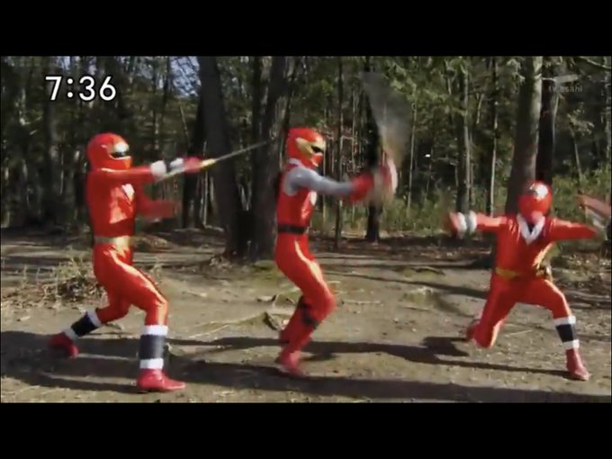 https://pbs.twimg.com/media/E1CCYYIW...jpg&name=small As Nanami politely turns him down (maybe Isshu should change his tact), they get the call from Mugensai, while Nao-chan digs her career another inch deeper. Back in Japan, Yosuke explains to Ryouga that the reason he’s insisting on working this mission without the Abarangers is because of his pride over Senpuujin destroying the city. Then Iga shows up and throws something onto their Hurricane Gyro and Dino Brace, which cancels their transformation before it can begin. https://pbs.twimg.com/media/E1CCYYxW...jpg&name=small Iga explains that it’s his JaNinpo: Kawarimi Fuji. https://pbs.twimg.com/media/E1CCf8dW...jpg&name=small Ranru, Sanjo and Kouta come to a riverbank, where Ranru decides to call out Sanjo for his lack of tact. Kouta on the other hand thinks he’d get on well with Yosuke (to be fair, they didn’t speak directly to each other). They are interrupted by the arrival of… Iga? (And something looks off about him) https://pbs.twimg.com/media/E1CCf9xW...jpg&name=small It appears that he’s killed Ranru… but then it turns out she was saved by a new arrival who apparently made record time coming back from Spain. https://pbs.twimg.com/media/E1CCf-wW...jpg&name=small But Iga takes advantage of this heartwarming moment to do his JaNinpo: Kawarimi Fuji. In the woods, Ikkou and Asuka actually seem to be getting along… then another Iga appears and seals their Gourai Changer and Dino Commander respectively. https://pbs.twimg.com/media/E1CCnjxW...jpg&name=small But before he can kill them, Iga steps on some tacks and gets attacked by the other new arrival (and for whatever reason, Abaranger’s 5 composers chose to play the “evil” version of the Gouraiger theme rather than the heroic version). https://pbs.twimg.com/media/E1CCnlBX...jpg&name=small As Isshu gets sealed as well, it turns out that all three groups are facing copies of Iga created to distract the heroes from his real goal. https://pbs.twimg.com/media/E1CCnlzW...jpg&name=small We then cut back to the two Reds in their battle, where it becomes apparent that they’re also facing a colour coded clone. https://pbs.twimg.com/media/E1CCnmuX...jpg&name=small But it’s at this point that Yosuke and Ryouga call upon their heroic resolve and defeat him with a Kage no Mai, Soragake and Gyro Shuriken combo. At the river, Sanjo weakens the blue Iga by using his chiropractic skills to remove one of his vertebrae, before Ranru kills him with the Dino Laser she built into her Dino Brace. https://pbs.twimg.com/media/E1CCxuFW...jpg&name=small Isshu then blinds the white Iga with his jacket, allowing Ikkou and Asuka to impale him on a tree, before destroying him with a Ikazuchi Raigeki-zan/Ryuujin Abare Finish combo. But the clones have served their purpose, with Iga having absorbed all the Dino Guts from the citizens. As Ryouga and Yosuke come to an understanding, Emiri alerts them to the situation and directs them to his location: a quarry. https://pbs.twimg.com/media/E1CCxwzX...jpg&name=small https://pbs.twimg.com/media/E1CC4duW...jpg&name=small As the Abarangers vow to stop him for stealing something that belongs to everyone, the members of Evolian (sans Reje, for obvious reasons) and the two Space Kunoichi show up to back him up. https://pbs.twimg.com/media/E1CC4eqX...jpg&name=small Mikoto then initiates his Bakuryuu Change (worth mentioning is that AbareKiller is the one Sentai Hero without a transformation sequence, even after he turns good. He simply presses the button, light surrounds him and he fades into AbareKiller). https://pbs.twimg.com/media/E1CC4ftW...jpg&name=small The 9 heroes then respond by doing their own transformation, which gets its own graphic created especially for this movie. Abarangers: Bakuryuu Change! Hurricanegers: Ninpuu, Shinobi Change! Gouraigers: Jinrai, Shinobi Change! https://pbs.twimg.com/media/E1CC4g9X...jpg&name=small Ryouga: Explosive Energy, AbaRed! Yukito: Explode Seriously, AbareBlue! Ranru: Explosive Dash of Courage, AbareYellow! Asuka: The Invincible Ryuujin Spirit, AbareBlack! Ryouga: The Savage Dino Guts… Abarangers: Bakuryuu Sentai Abaranger! Yosuke: The wind blows and the sky rages; Sky Ninja, HurricaneRed! Nanami: The water dances and the waves crash; Water Ninja, HurricaneBlue! Kouta: The land trembles and the flowers sing; Land Ninja, HurricaneYellow! Yosuke: Unknown to the people,… Nanami: Unknown to the world,… Kouta: We become shadows to combat evil. Hurricanegers: Ninpuu Sentai Hurricaneger… Yosuke:…has aaaarrived! Ikkou: The Crimson Lightning; Horned Ninja, KabutoRaiger! Isshu! The Azure Thunder; Fanged Ninja, KuwagaRaiger! Ikkou: I face the darkness, I slash the darkness… Isshu: I face the light, I slash the light… Both: Denkousekka Gouraiger, Revealed! After the roll call, Ryouga makes a declaration that catches on in later VS movies like wildfire. https://pbs.twimg.com/media/E1CEvklX...jpg&name=small The fight then begins with Sanjo riding on Kouta’s back as they and Asuka fight (for a given definition of fight, given how intricate the costumes are) Mikeala and Voffa, sending them packing with Asuka’s Dino Thruster: Triple Inferno, the Gouraigers managing to be the first people to get the edge on AbareKiller in a fair fight (for reference, he’s consistently one of the toughest opponents in the series), Nanami dangling from Ranru’s legs in a battle against the female villains (I had a picture, but the quality was terrible, so I omitted it) and Yosuke and Ryouga taking on Iga, only getting the advantage by using that same technique Yosuke performed with Kouta that one time, before Ryouga goes into AbareMax and defeats Iga in the Max Field. The two groups then combine the Victory Gadget and the Super Dino Bomber to create a new weapon. https://pbs.twimg.com/media/E1CEvkhX...jpg&name=small With a declaration of “Victory Dino Dynamite”, Iga gets blown up. But then he uses the Dino Guts he’s coll