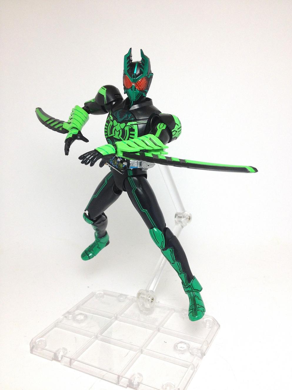 the multiplying, high jumping, and electrocuting GataKiriBa is the first full color Combo to appear in Episode 6, activated when Uva's Kuwagata (Stag Beetle), Kamakiri (Praying Mantis) and Batta (Grasshopper) Core Medals are scanned in the OOO Driver. The Figuarts includes seven alternate hands, the OOO Scanner, the MedaJalibur, and three sets of Kamakiri Swords; one in their default state (within his gauntlets when you first receive the figure), another in an attack state, and the last in their handheld state.