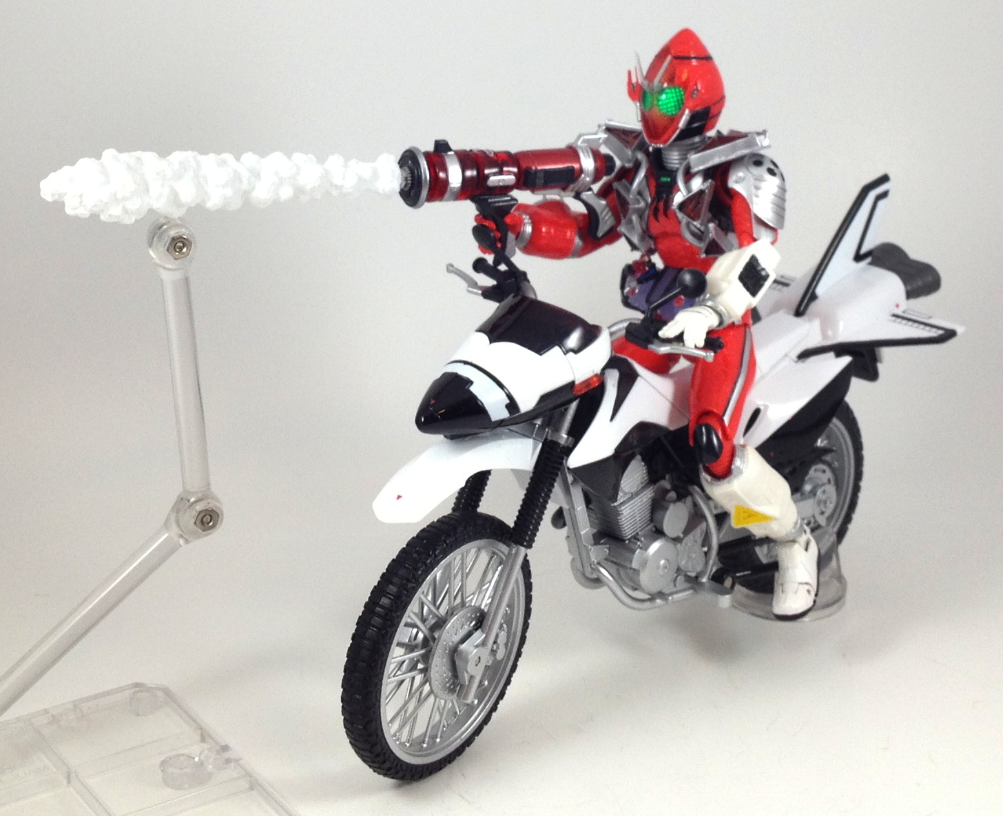 The Fourze Effects Set contains a drill effect, Elek States and Fire States themed Tamashii Act 4 stages bases, three Act 4 stage arms, a smoke effect base, 2 electricity effects, and a flame effect. I would have liked another fire effect of any kind, but what we get is great.