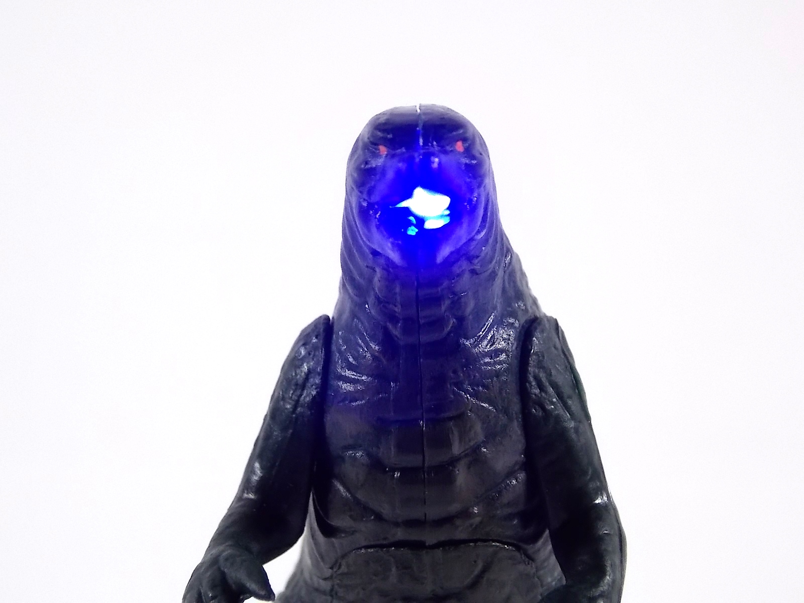 . The sound effect is nearly identical albeit it smaller. The blue LED is also quite bright and verrrrry blue. The button to activate this isn't visible but is instead embedded underneath the soft rubber spines on the back. And that's about it for the figure. Beyond that we have the included