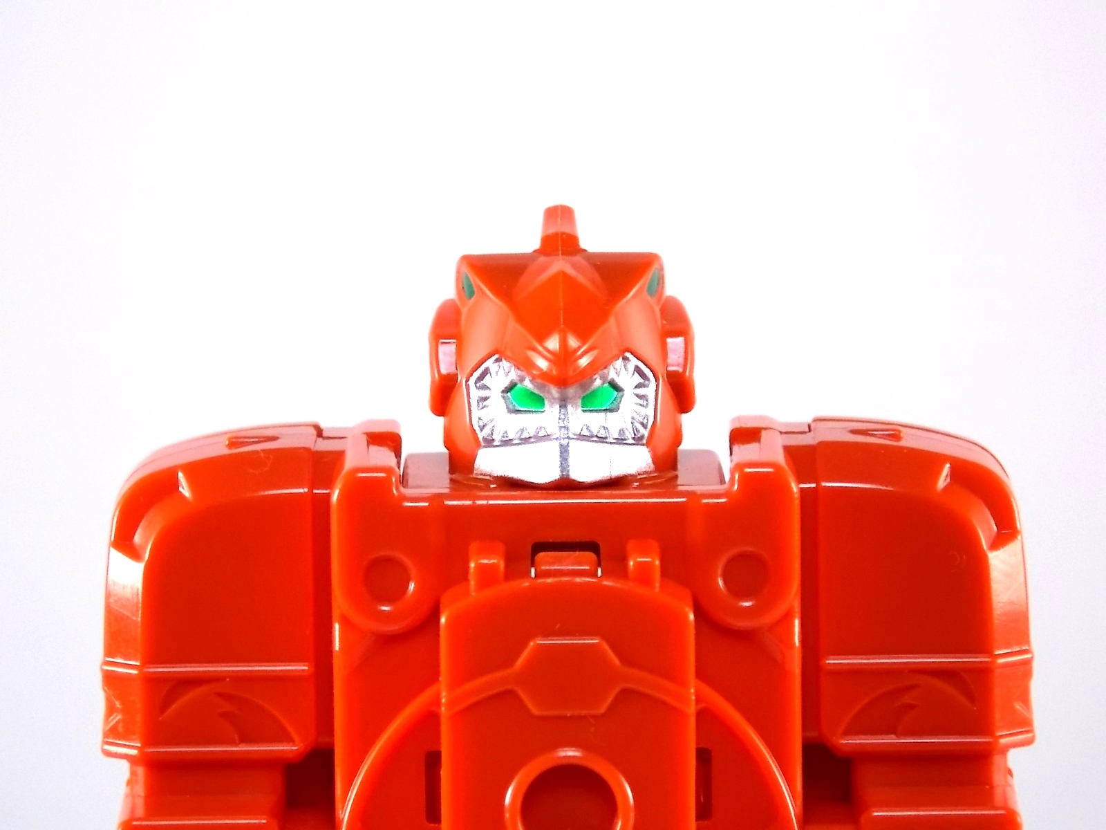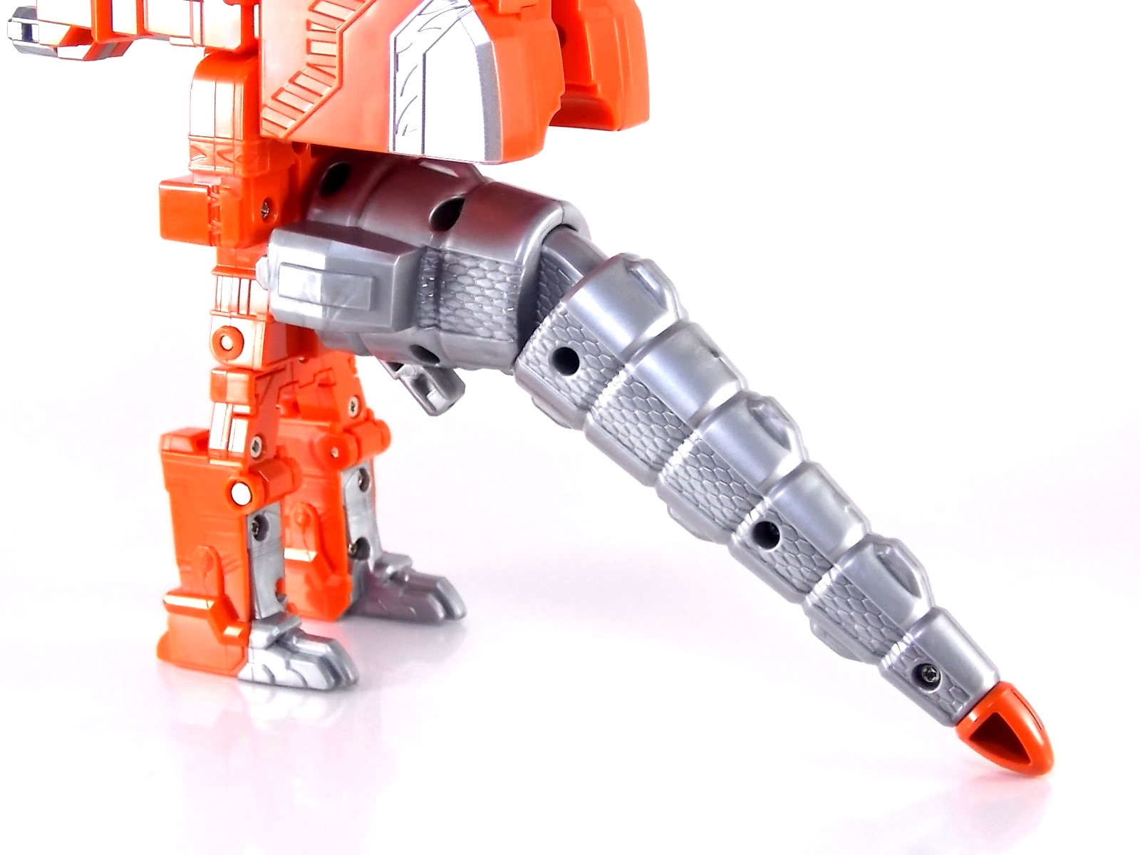 To create it you need to first take the core humanoid body and ben it forward at the hips. Then take the the two hammer like weapons (which were axes on Paonmaru) and plug them on to the back of of the robot. Then attach the included T-Rex head onto the pair of clips on this back section and rotate the face down, the mouth can then open as well. The Shuriken itself with the disc attached then plugs onto what winds up being the tail of the figure, on Paonmaru it would have been the chest. Then simply plug the T-Rex tail on and use the joint at it's base to angle it up to allow clearance. Thus completing the look! It's actually a pretty intricate little figure in this mode, it's a little orange brick, but a fun one.
