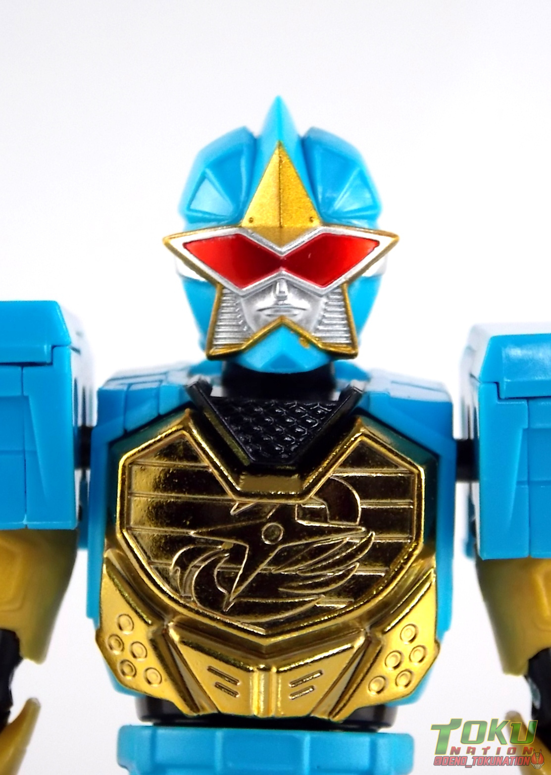 And we should also take a look at the final 2 gorgeous components of the figure, the golden chest plate, and that wonderfully sculpted head. Now while the head IS sculpted very well, the paint can vary figure to figure. As you can see below mine has a rather noticeable golden droplet just below his chin. Sadly I have to report that the head wasn't designed to angle up at a 90 degree angle like the DX either, so when you do combine it to form Bison King, you're going to have some issue with the head sticking out too far, as pictured.