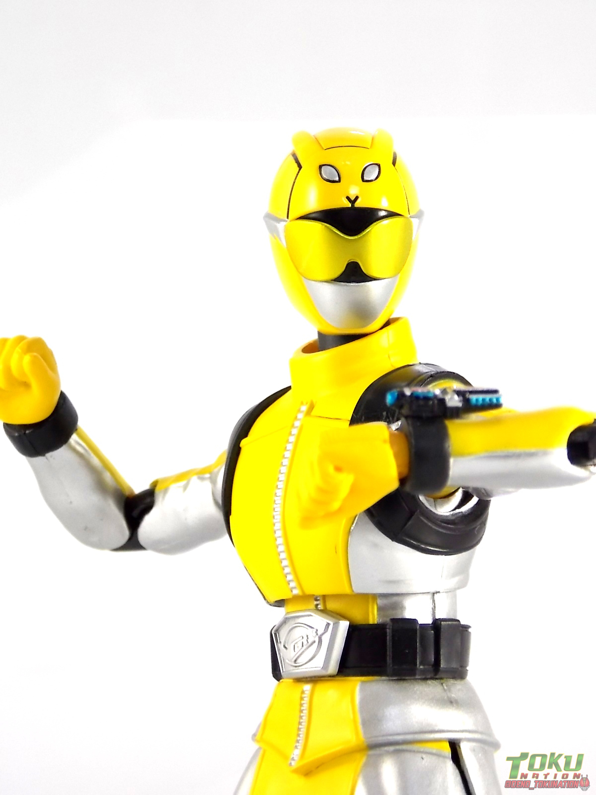 Sadly the elbow joints are incorrectly colored black rather than silver & yellow. I believe at the time of release it was assumed it's because that plastic wouldn't take to paint very well, the black does draw your eyes' attention but not terribly so, and the elbows function just fine too, perhaps being a tad bit limited. Yellow Busters' arms are also one of the last sentai figuarts releases to feature