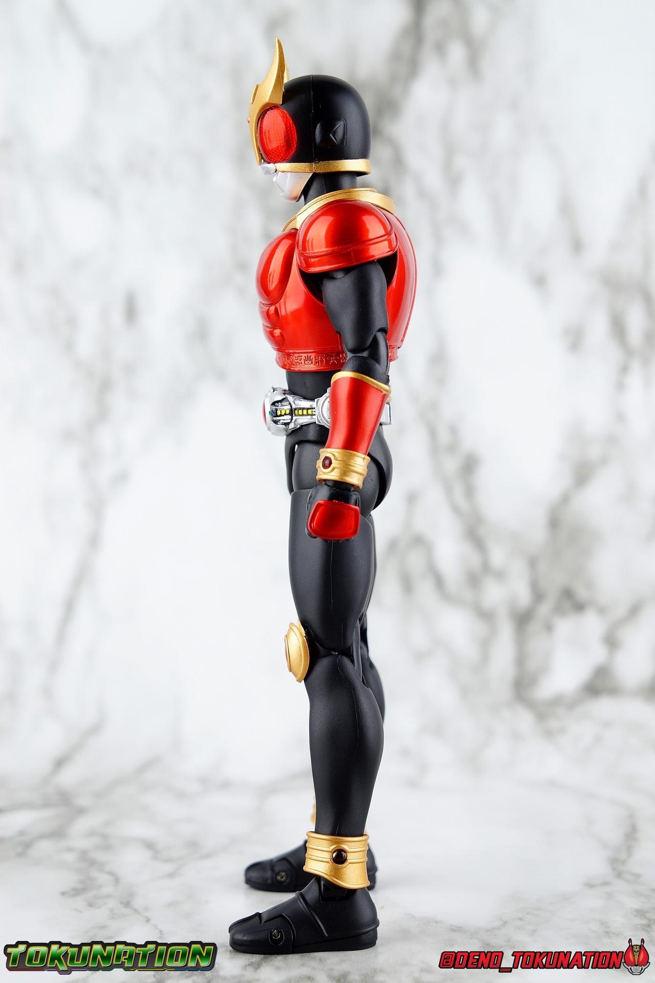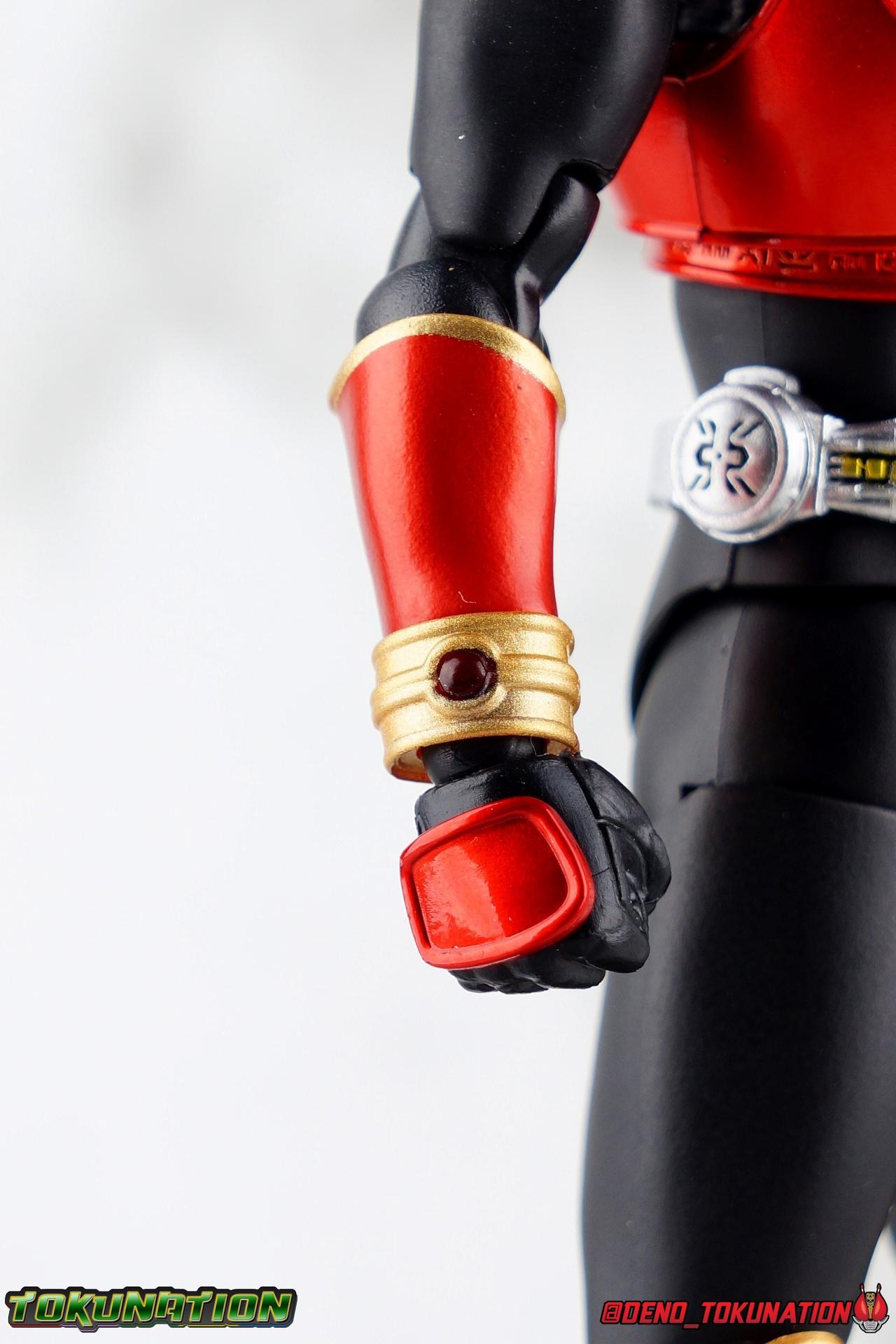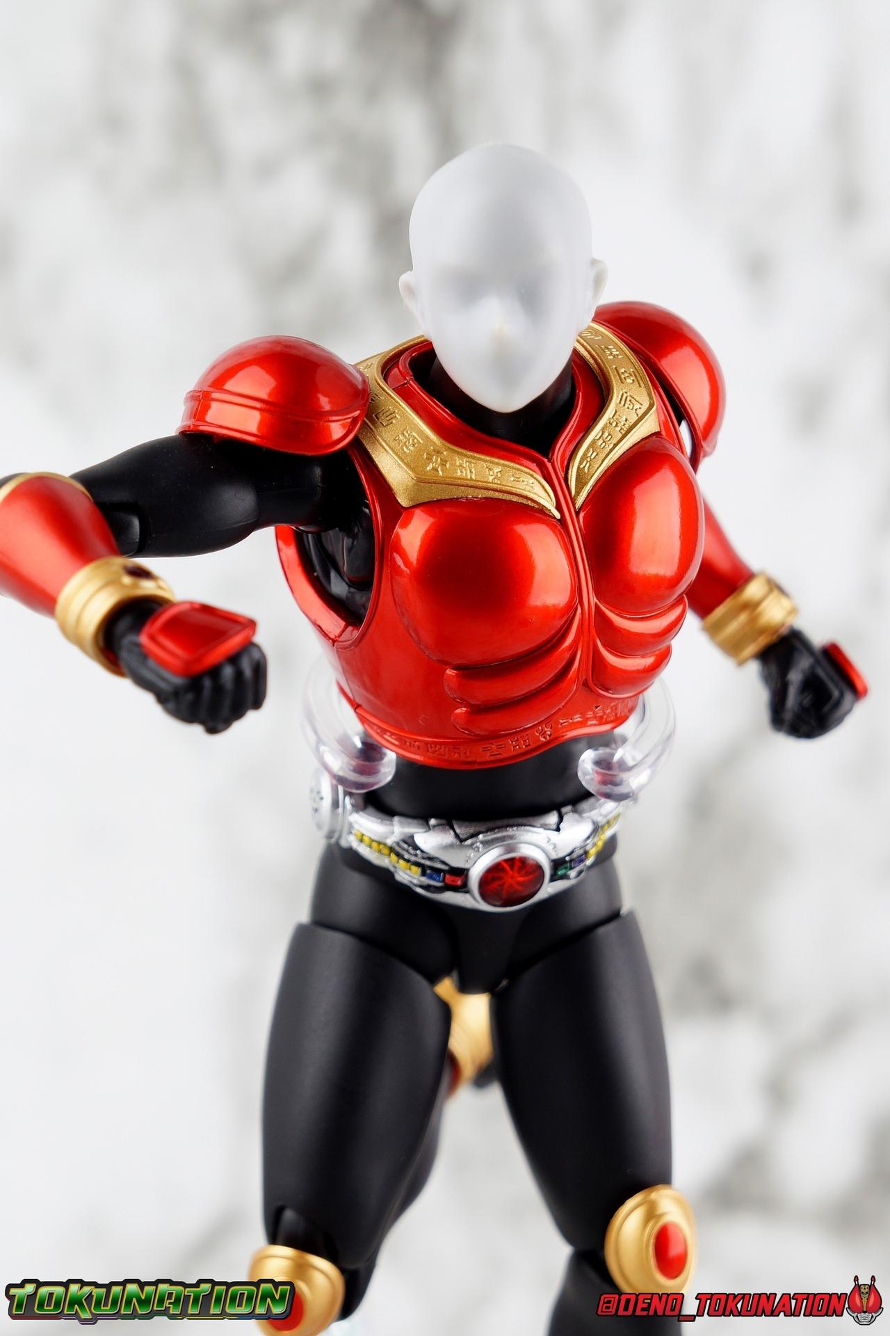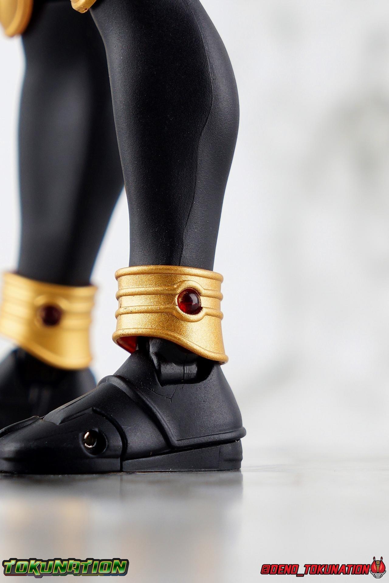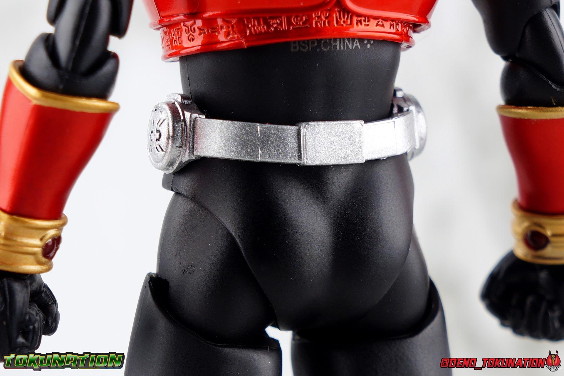 of course takes direct inspiration from the Typhoon. While it isn't really a gimmick laden belt at this scale, it's gorgeously sculpted and painted. The torso is separated into 3 components; a matte black lower abdomen, the metallic chest armor, and a small floating piece of armor between the two. The ab section rotates and arches pretty freely which is great, while the upper chest does the same. It's the mid riff armor that does the bulk of the work to make the figure look great statically and dynamically life like. Filling gaps as you pose the figure, this small bit of armor goes a really long way. Like Kuuga's lower half the upper body works in unison to create a really well engineered figure. The ornate gold details on the armor are also just magnificent.
