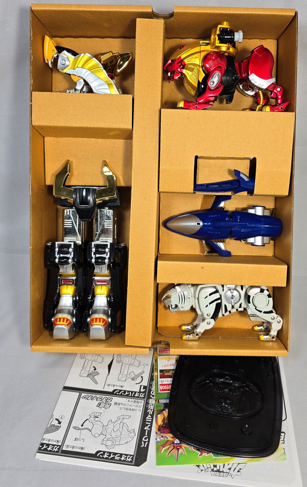 . Transformed a number of times, mostly displayed in detolf for many years. Very good condition overall. Stickers applied and in excellent condition. Many years ago, I slightly modified the Shark's sword clip to hold the sword better, and painted in black. 100% complete with all parts, including non-pictured stand, instructions, and all packaging. Box has minor storage wear.