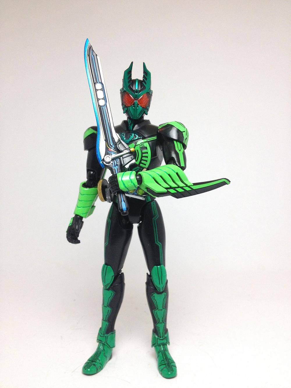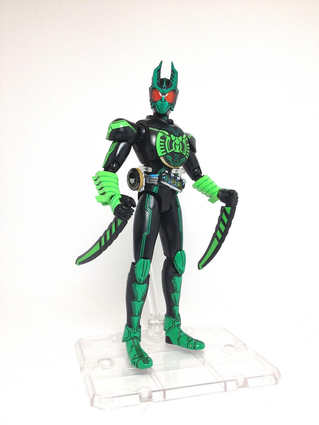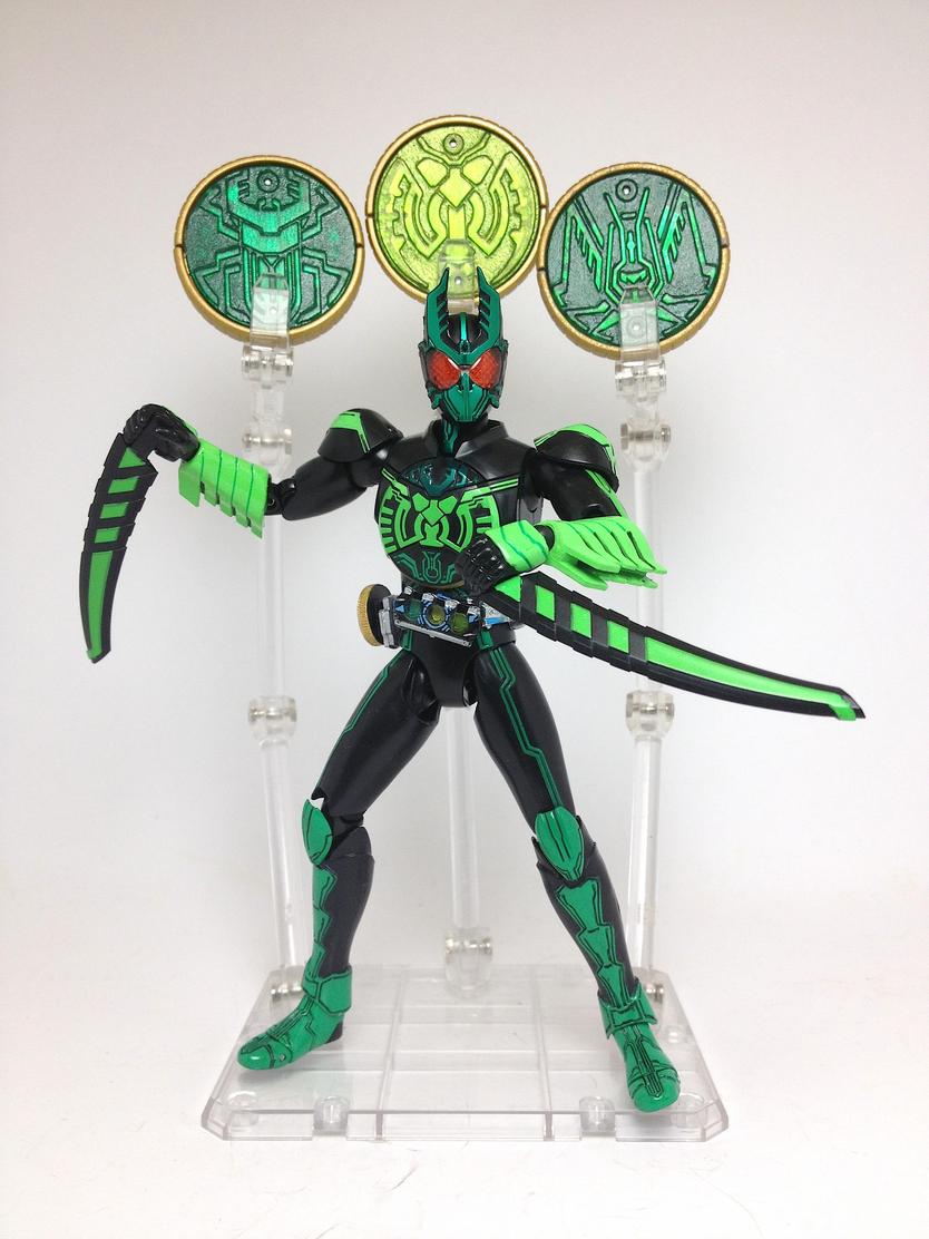 the multiplying, high jumping, and electrocuting GataKiriBa is the first full color Combo to appear in Episode 6, activated when Uva's Kuwagata (Stag Beetle), Kamakiri (Praying Mantis) and Batta (Grasshopper) Core Medals are scanned in the OOO Driver. The Figuarts includes seven alternate hands, the OOO Scanner, the MedaJalibur, and three sets of Kamakiri Swords; one in their default state (within his gauntlets when you first receive the figure), another in an attack state, and the last in their handheld state.