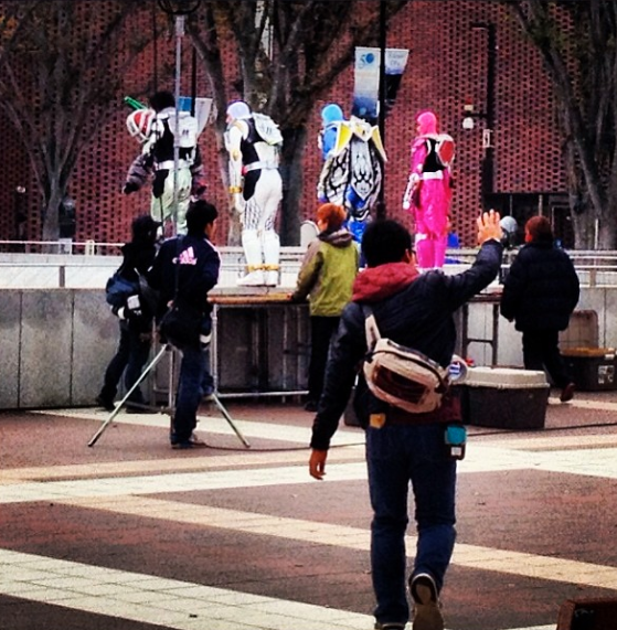Seen here (left to right) are Cherry, Shin Zangetsu, possibly Lemon, and the Peach Energy Riders. Names have been circulated previously for these characters though they aren't necessarily confirmed. Rain (Lemon), Do-Q (Cherry) and O-gi (Peach). Kamen Rider Gaim of course has already debuted