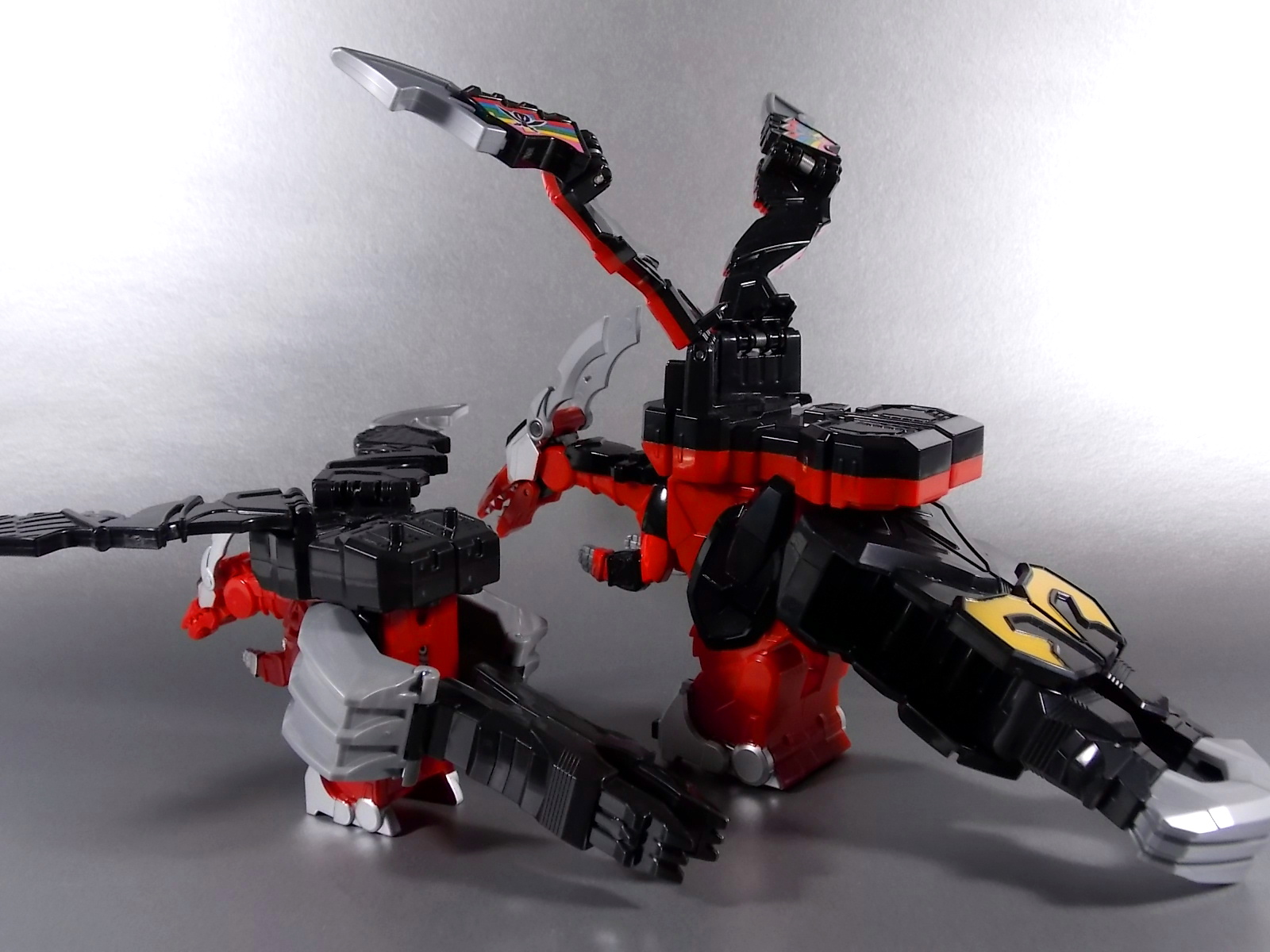 Though it loses out in paint and a bit of complexity there is some added interaction with the included Red Mystic Ranger Key. On the original Magi Dragon you could pull back on the spring loaded wings to flap them. Here you can insert the ranger key into the dragons back while the head is folded in to spring it into place as well as flap the wings.