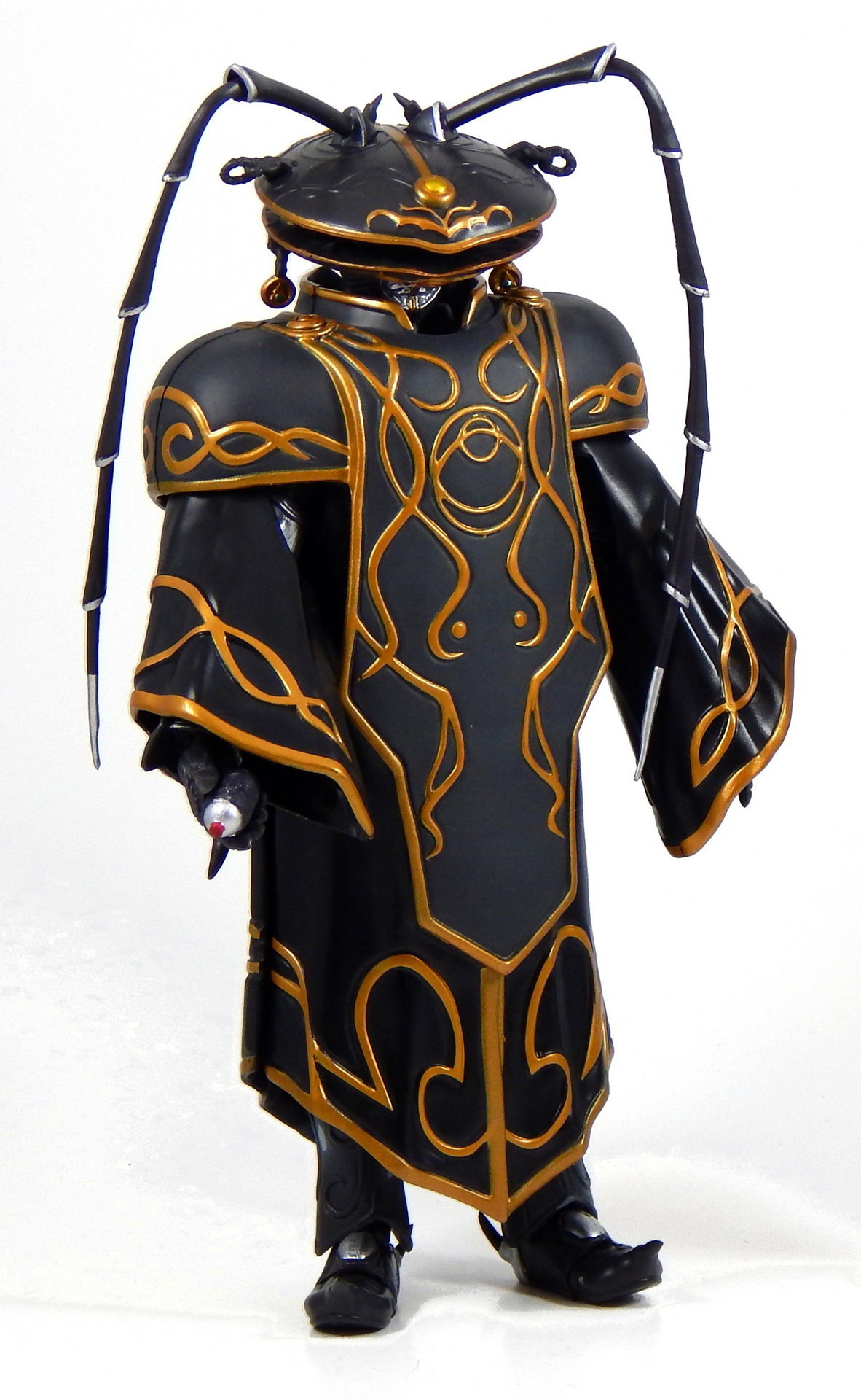 Looks-wise, the figure is pretty awesome, but the articulation is where it started to let me down. It has all the standard Figuarts articulation, and the range of movement on most of it is what you would expect. My complaints are with the back cockroach 'wings', which are a single, solid piece, with absolutely no flexibility. In fact, it's made out of much too thick, or heavy a plastic, and it slightly affects his posing, in that it's hard to get the torso pieces to line up so the gold line down his front is straight. Also, Libra will never be able to sit down, as the wings extend far past his waist, down to the knees, in fact. Additionally, his legs can't move back very far, again, blocked by the wings.