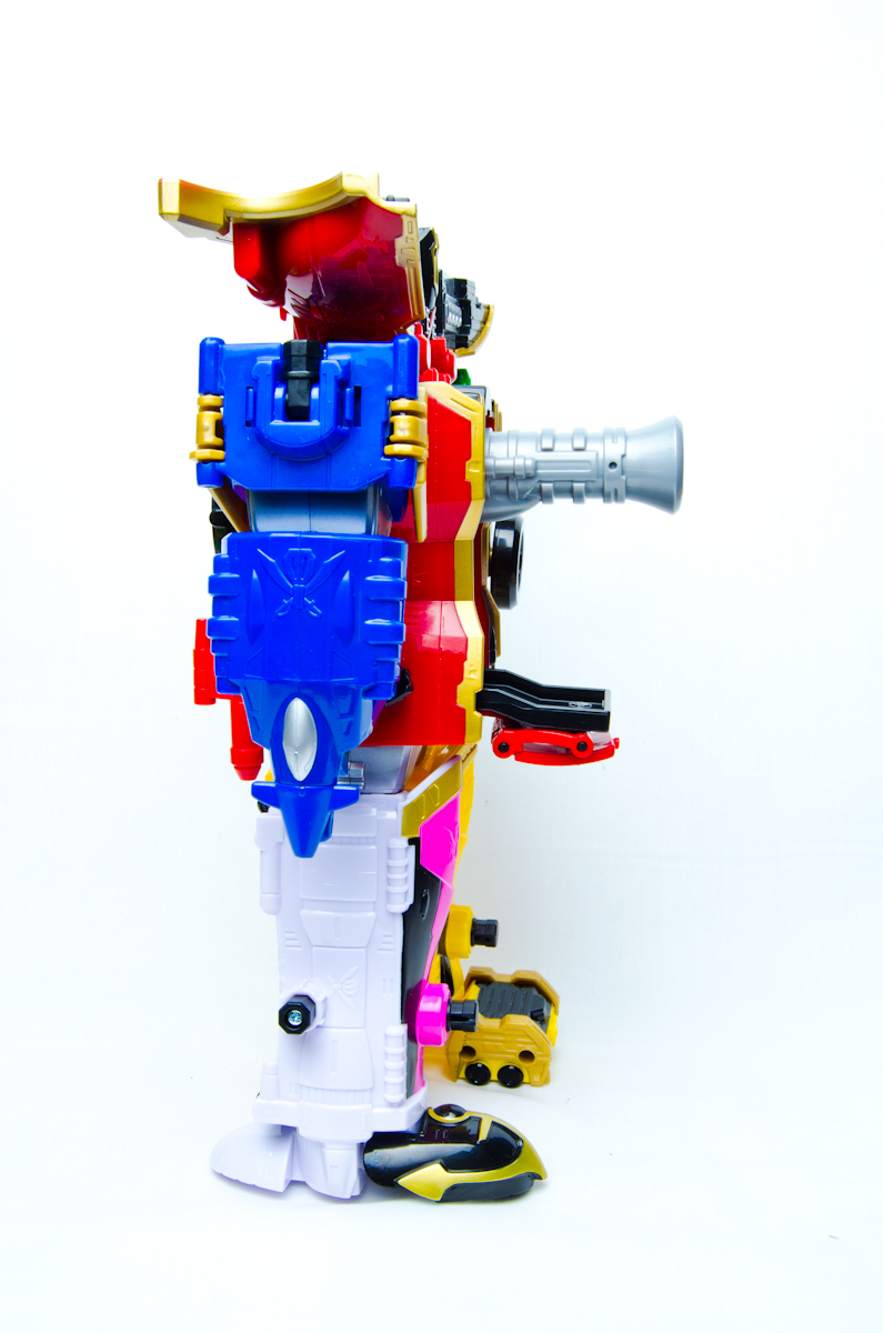 system, this Megazord has a total of 10 ports including 2 male connector pegs and 2 female ports on the torso, 1 male connector peg on each 'forearm weapon', 2 female ports in each shoulder piece, and 1 male connector peg in each hip.