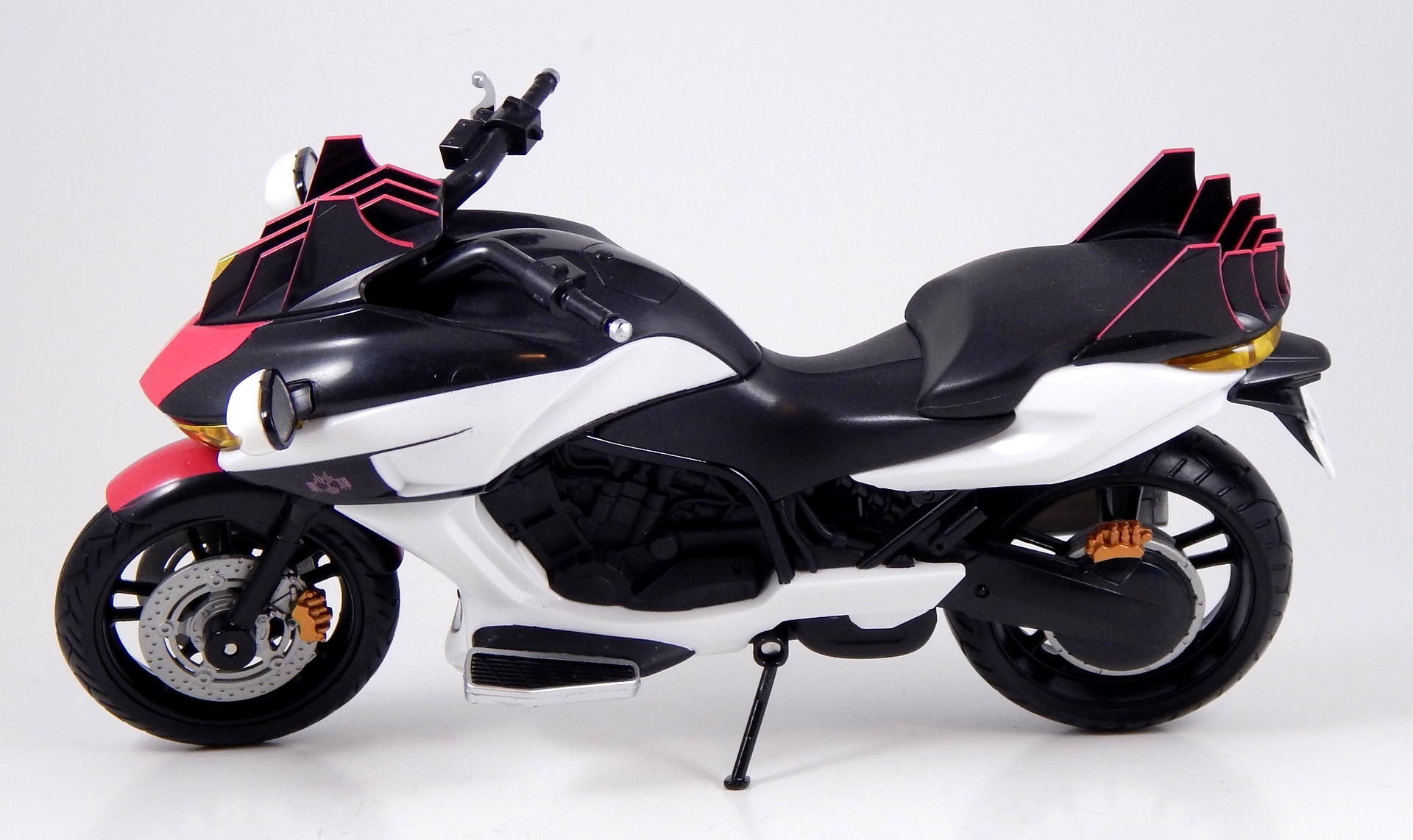 himself, can take on the form of other Rider's motorcycles. Sadly, this toy does not exhibit this ability, and only takes on the one form. It's probably just a ploy by Bandai to get us to buy the other bikes separately. The only gimmicks this bike does have are the free-spinning wheels, the slightly turning front wheel and handlebars, and the slight bit of suspension on the rear wheel. And the fold-out kick stand.