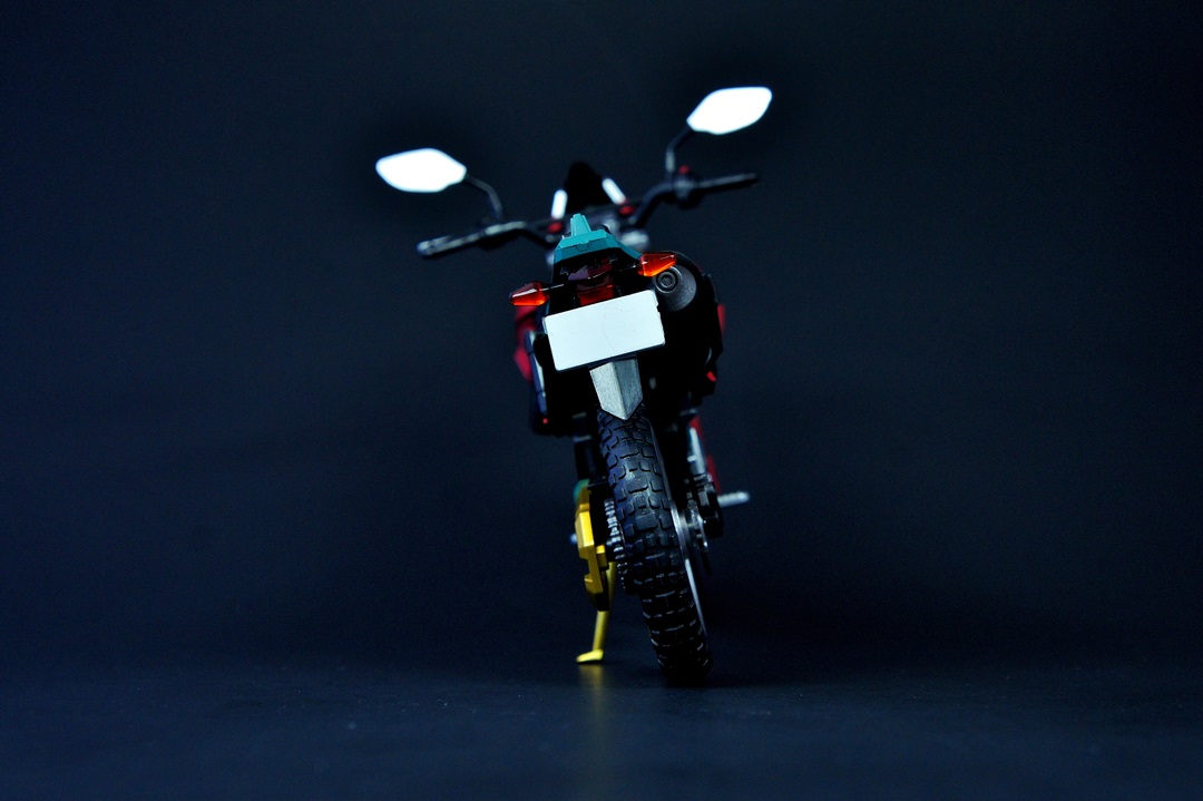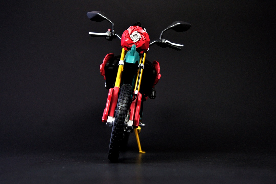Nothing super out of the ordinary here. It's a good sized box and comes with the usual accessories for the bikes - replacement handles and mirrors and the plastic stand so your character can look like he's riding it without the kickstand having to be down. The box itself I like - the rose-colored red really stands out and goes well with the other colors on the packaging. It's eye-catching and draws your interest with the vibrant primary color of red highlighted with green, black, and silver.