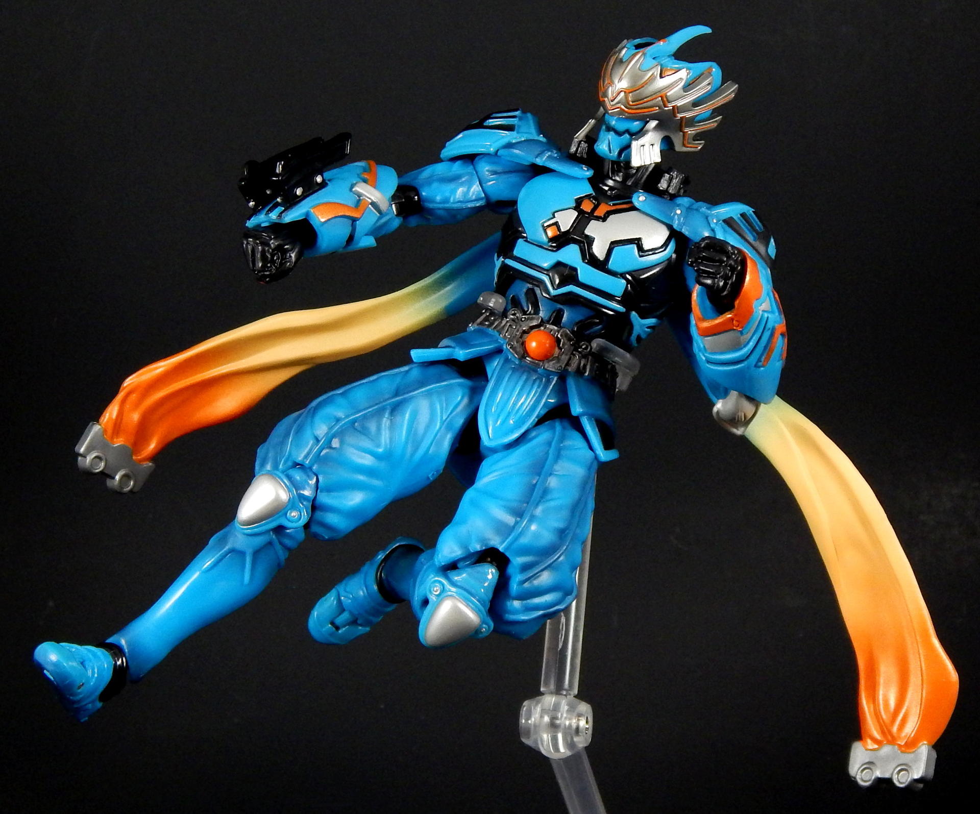 His scarf? Cape? What are those things on his back? Anyway, they're on a ball that lets them swivel out to almost parallel with the ground, and they can be lifted backwards too, though to get them to stay out like that I had to half-pop them off the ball. Oh, the ankles are not my favorite type of joint, being a ball-peg that the foot plugs into. There's not ankle hinge like W has, but unlike other Figuarts that have this type of foot joint, Nasca's actually has a pretty good range before the foot collides with the leg.