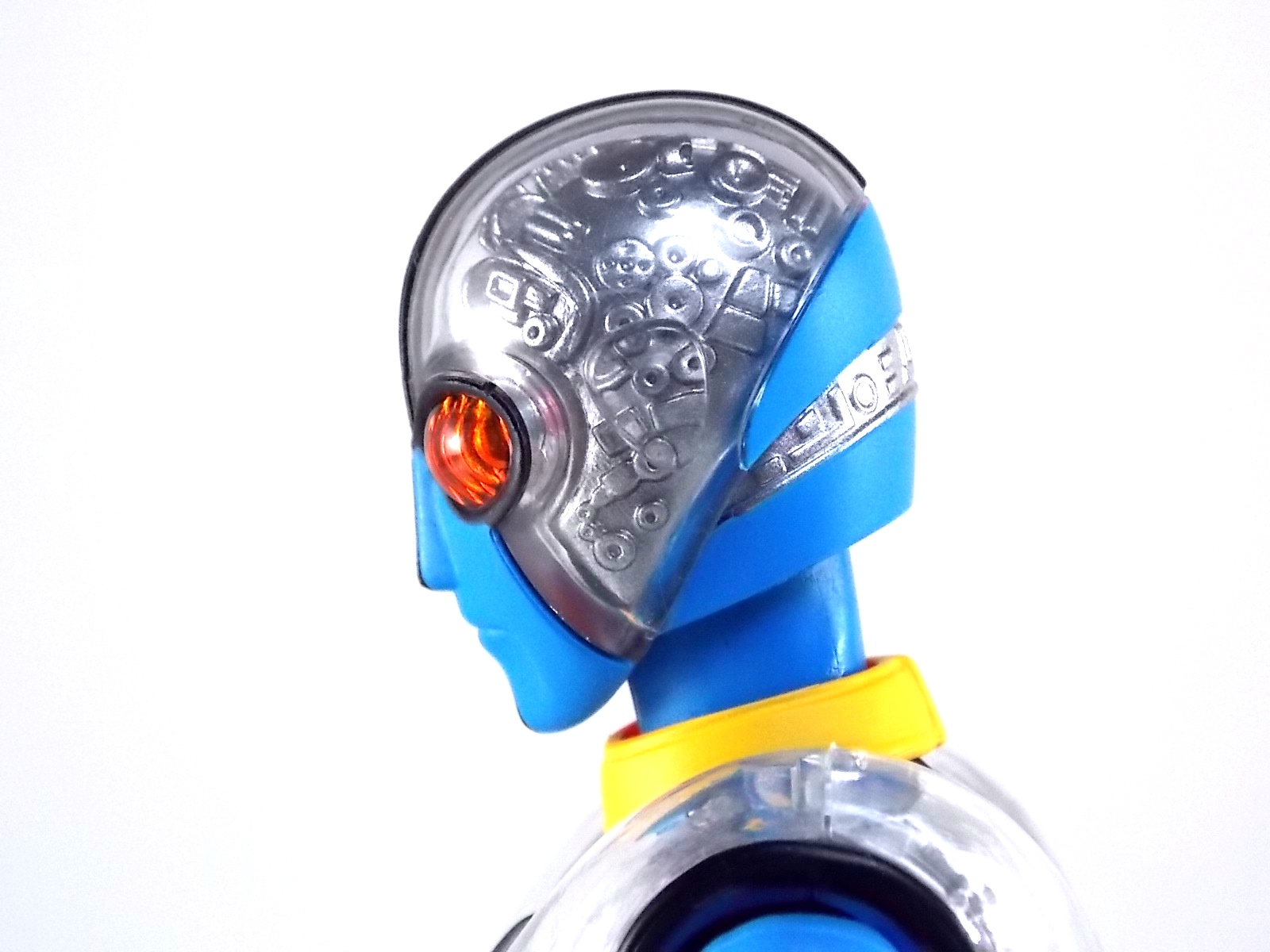 hips is very nice because there's no bulk or armor around them like many Kamen Riders to hinder that type of motion. The waist is very free to move side to side and front to back, while the ab crunch area works flawlessly. Even the head design has ditched the funky diagonal neck joint the first Kikaider had and has gone with a much more traditional, albeit better, ball joint. And the head just looks magnificent. Absolutely spot-on sculpt and detailing with some great eyes. Though not nearly as great as the glowing death eyes on