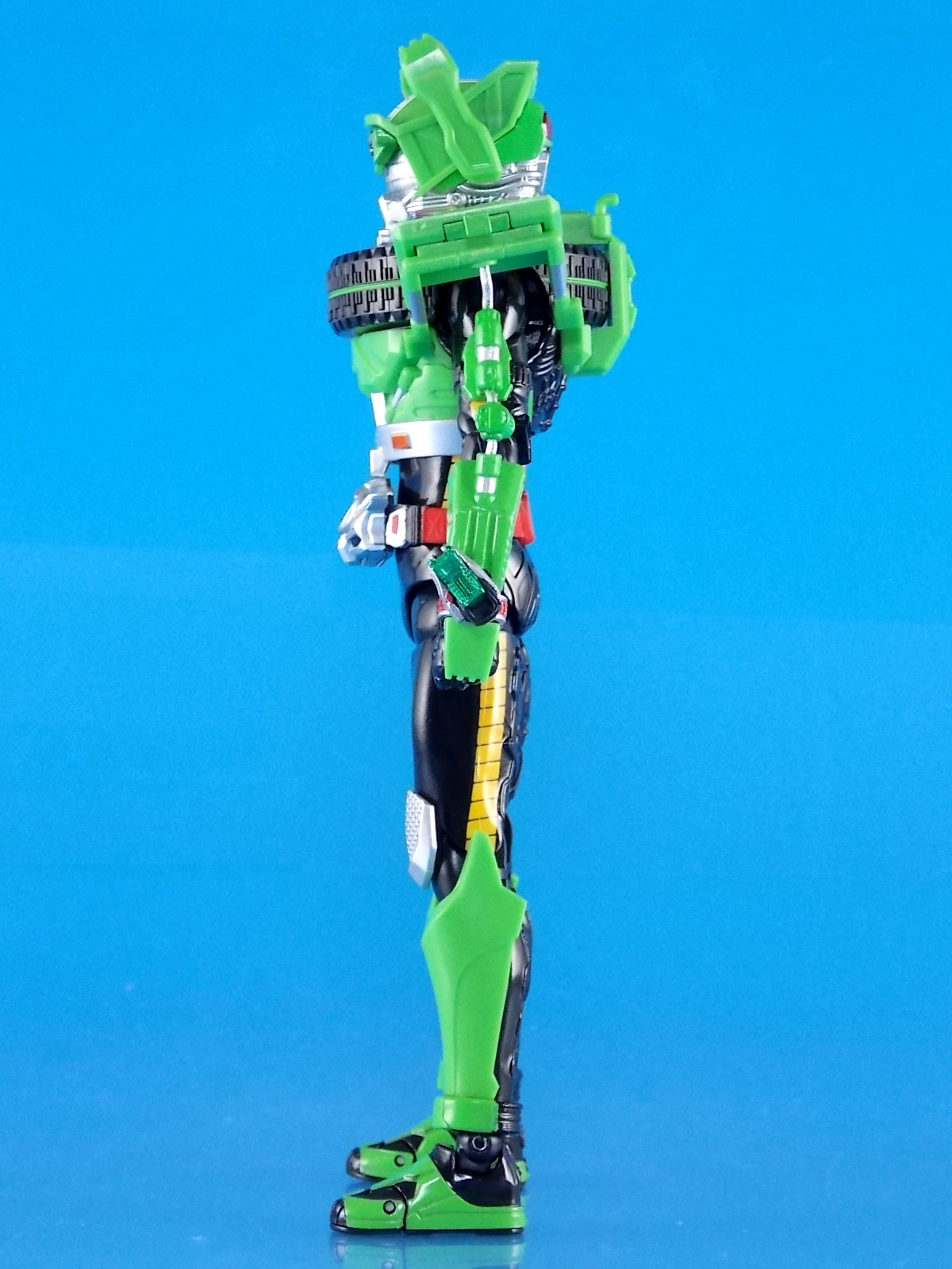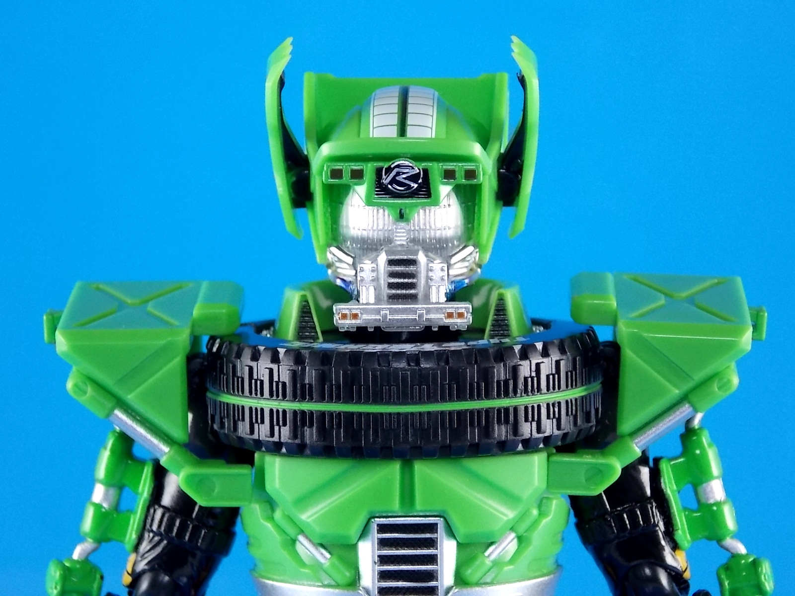 features yet another Tire system that's incompatible with anything else, essentially the front and back portions are just tire slivers that can't even form a full tire when detached. You even have to remove a green part of the back to get the rear portion out. While I find this to be a pretty bad design I'm more frustrated that they couldn't find a better way to design the shoulders to work around the way they half-assed the tire. The tire also impacts the head's movement a bit, though admittedly the head is also rather large. But that's not to detract from the head, it looks fantastic, it just doesn't have as solid a range of movement as it should. You get more out of it than I expected given the design, but that big bulky chest can be a pain.