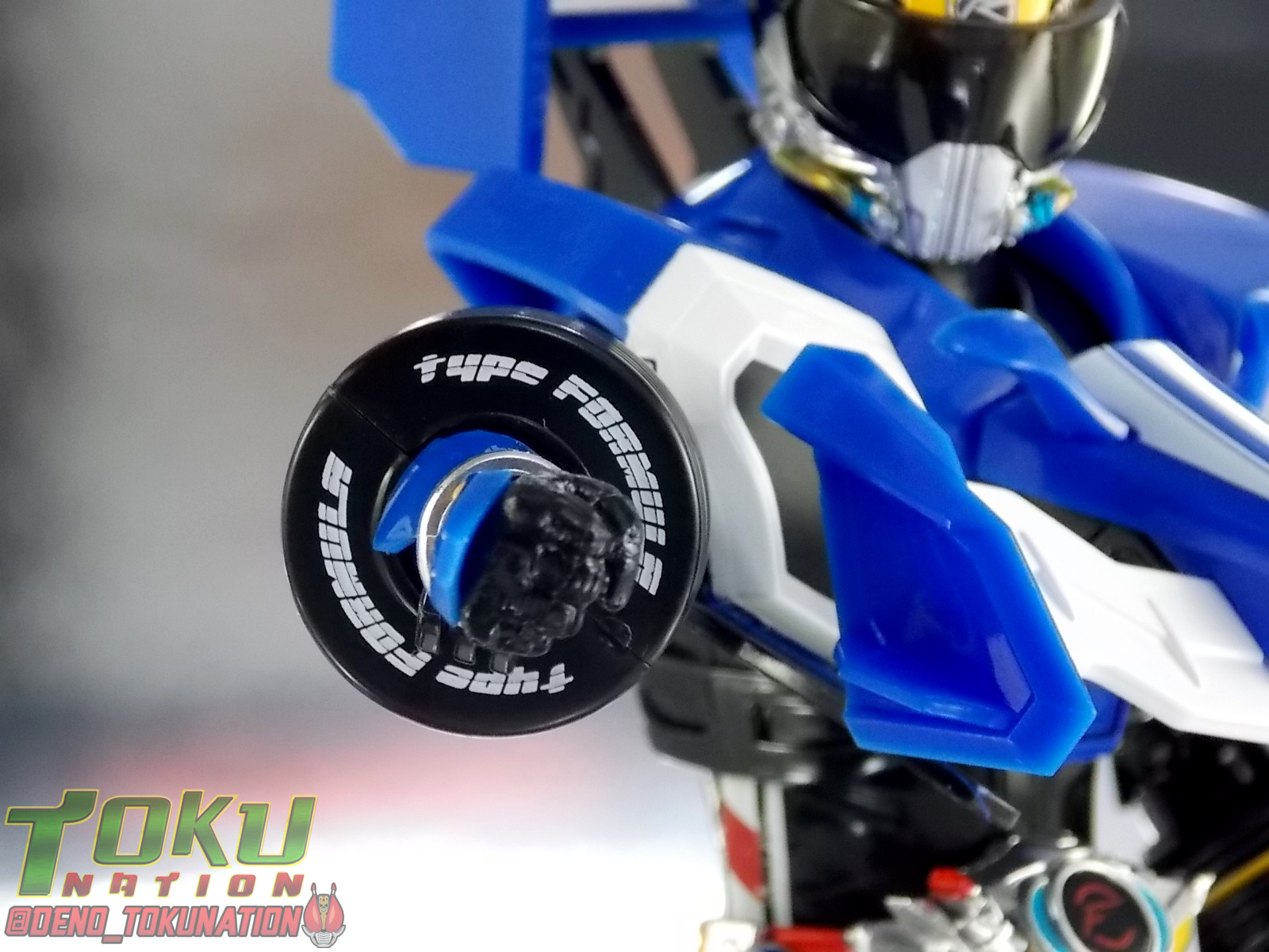 These smaller tires thankfully do no significantly hinder the arms posability. The Tire Koukan Formula figure, as well as the show prop, could exchange these tires in favor of other power ups but much like Proto-Drive this figure has not been designed for these Tires to be removable.