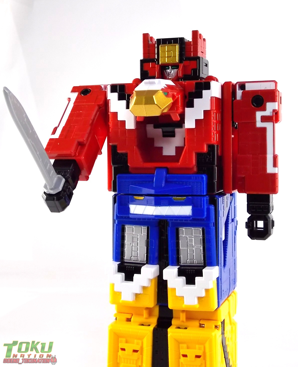is even simpler. Just fold the Kirin head straight up. Done. For it's size I can't blame it for being simplistic but WOW is it simplistic. For Zyuoh King to use Cube Kirin you just need to rotate his arm up one click, then plug the Bazooka's handle into his hand. You also have to line up a small indentation on Zyuoh Kings' shoulder with one on the rear of the bazooka. This helps stabilize it as there is no locking mechanism to hold it in place whatsoever. Meaning you can't put Zyuoh King's arm down either or the Bazooka leans severely enough that it could fall out. A tad bit disappointing but for something this small, and this cheap, what did any of us really expect?