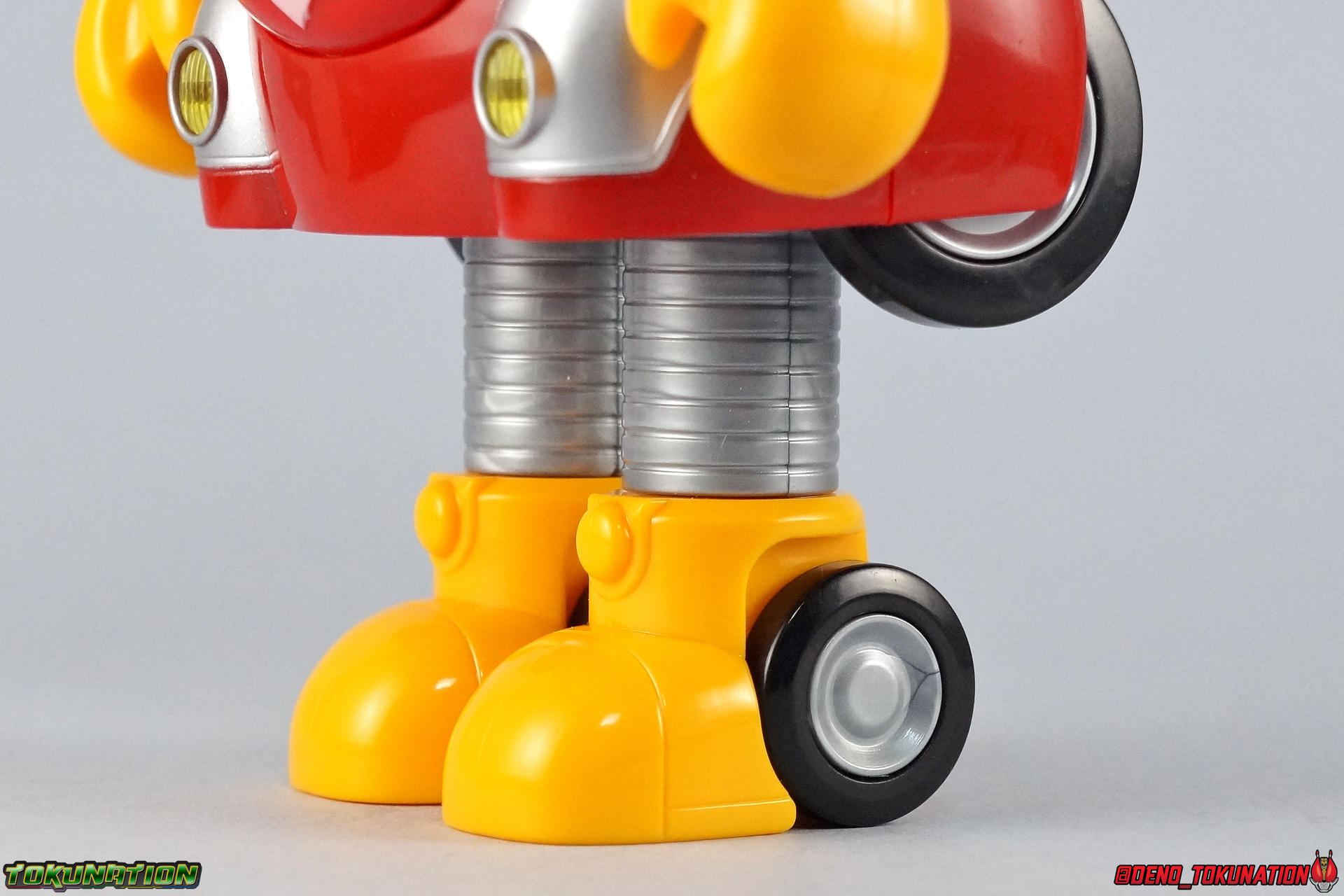 Unlike his predecessors Robotack & Kabutack rather than transforming from a cute SD style robot into a more proportioned fighter, he transforms into a kind of silly 4-wheeled vehicle. Simply rotate the feet backwards and the legs back up behind the torso, then rotate the front wheels down from under the main bot and you're done. This goofy little mode may not win you over, but it's fun enough that I can get behind it. Robocon does techincaly have a proper super mode, but it's really only achievable with the aid of his tiny robotic friend