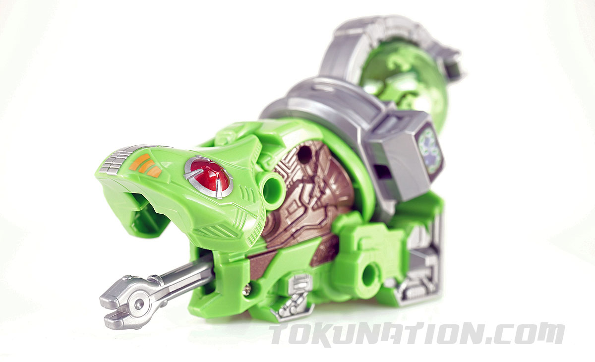 This thing is LITTLE. How it manages to form an arm or a leg compared to the others is mystifying to me. The green is a nice soft green. There is no articulation on this voyager aside from the fact that the mouth can open and close, revealing a cool surprise - the tongue can extend out! That was an unexpected and pretty awesome little feature that helps Chameleon Voyager standout compared to the weaker of the voyagers, like Kajiki Voyager.
