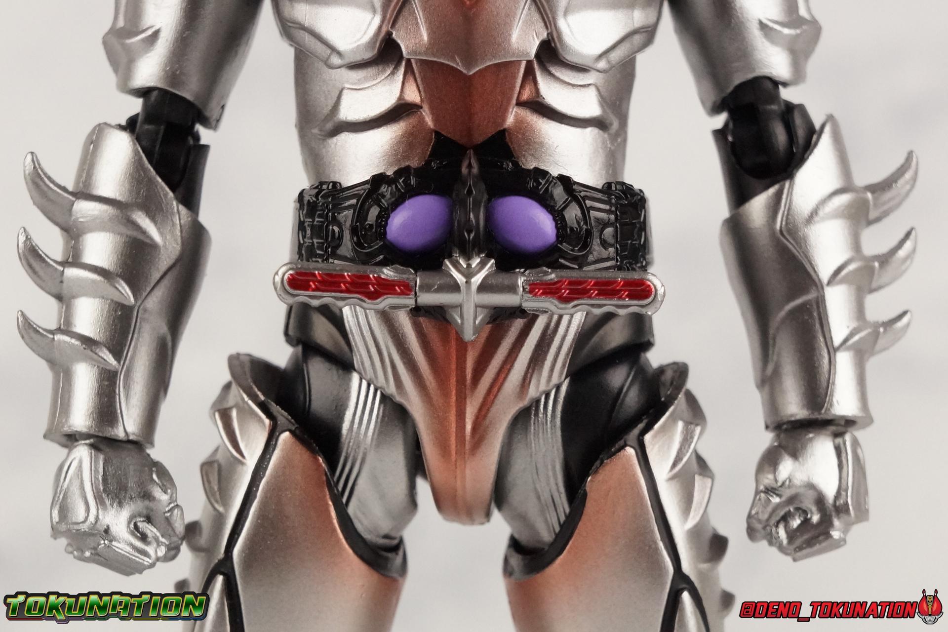 is looking great. It's eyes are more thickly painted than I'd like though so the colors don't quite pop the same way as his helmet. The handle on the right side is still removable as on the other 2 Amazons riders, even if he has no weapons to make from it. The upper body itself is just insanely gorgeous. The way the chest is seated on the torso allows for some great arching in his back. You can definitely get some good evil/crazy guy poses that the best villains would be proud off. Kuroto Dan would be proud. Again the bronze paint applications make him look fantastic here too. And the sculpt for the upper body is sharp & clean.