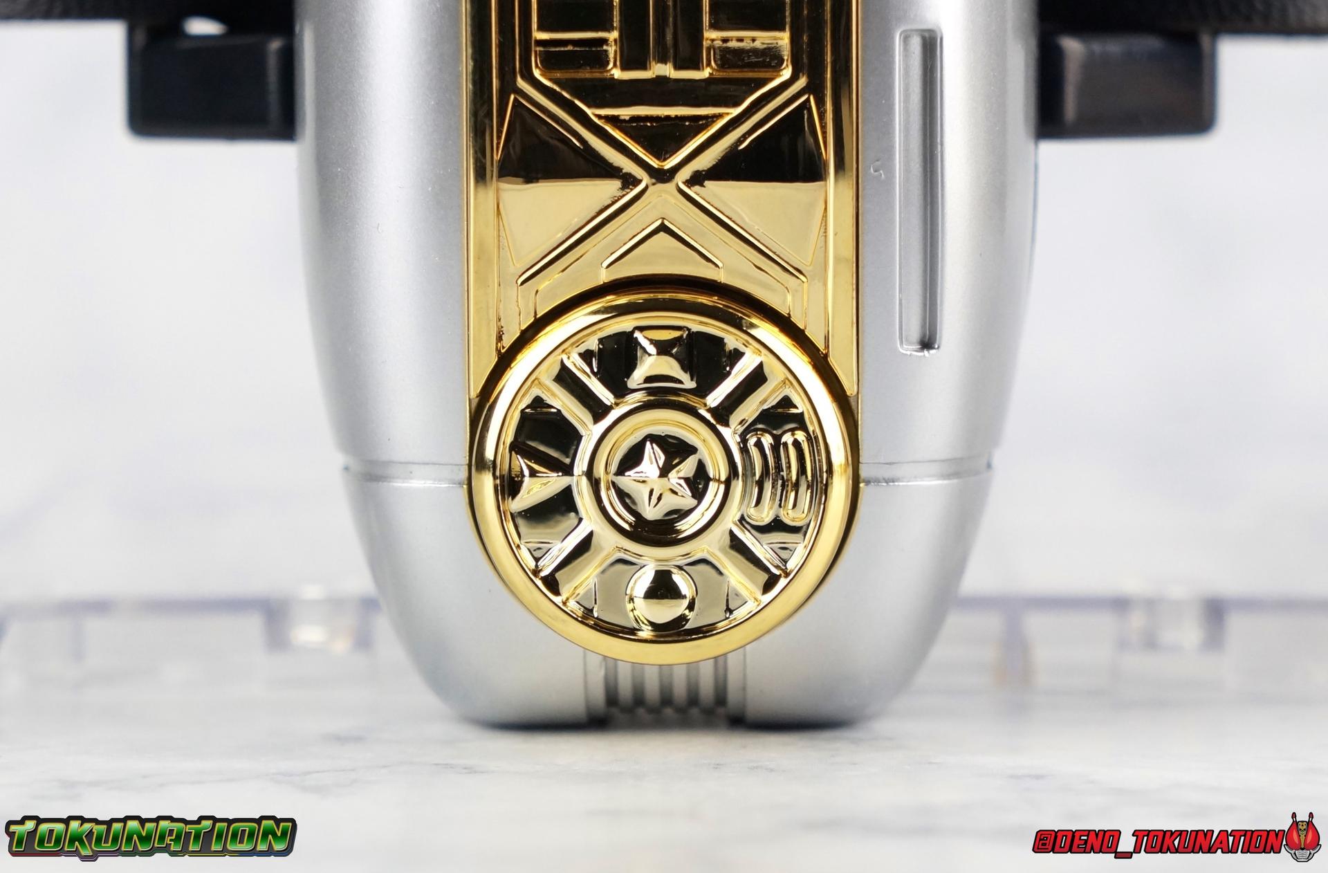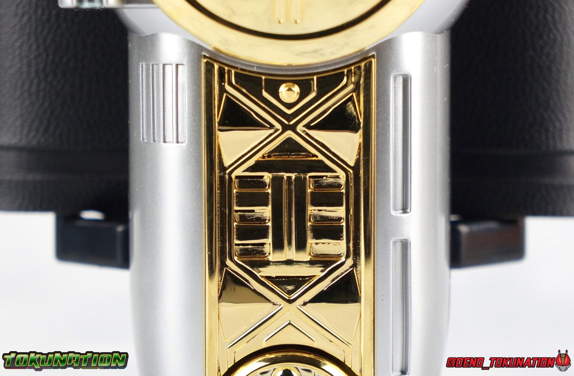 Beginning with the left Zeonizer, this is where a majority of the chrome detailing, diecast, and all the electronics are present. Like the original toy we get some gorgeous gold chrome through the center. At the bottom end there's another one of those Zeo tribal symbols. HOWEVER this one is actually a