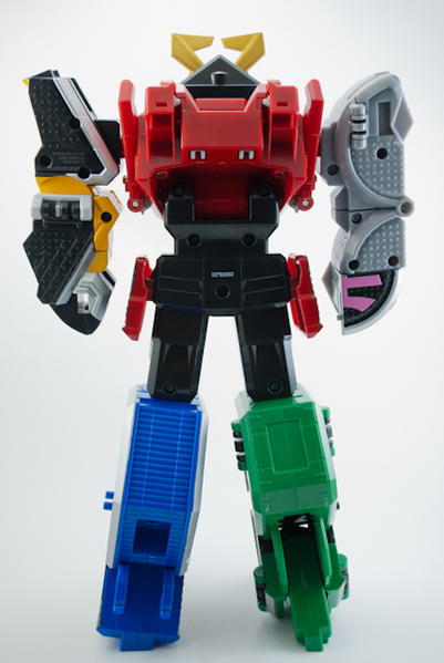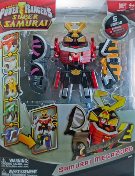 As Super Samurai's story comes to a close and Megaforce is poised to flood the toy aisles, Tokunation is taking a look back at some of the deluxe zords and role-play items we received during the past two years. We'll begin with a gallery of the deluxe Samurai Megazord, comprised of the lion, dragon, bear, ape, and turtle foldingzords. This figure continues the 'Zord Builder' feature introduced in the 2010 Mighty Morphin' toy line which allows each limb to be switched out with other zords for a variety of combinations. The Samurai Megazord is a new and different mold from the Shinken-Oh released by Bandai of Japan for Samurai Sentai Shinkenger. Although the five foldingzords in the BoA release lack an emblem mode, it allows for a more streamlined combination.