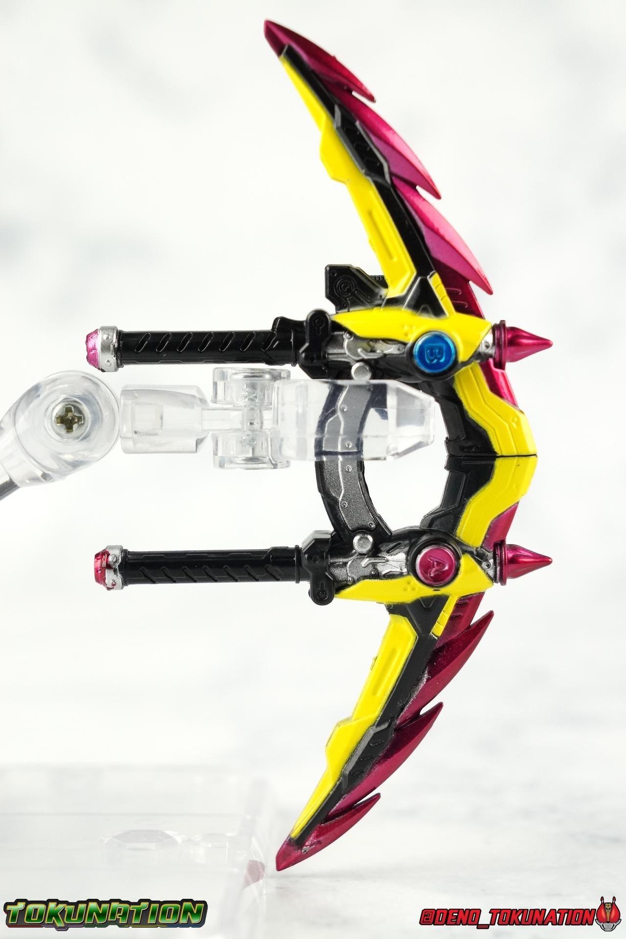 The trademark weapon of Kamen Rider Lazer. The two halves care plugged together in the middle via a small black two-prong tab. Which is actually an improvement over the original Sparrow that came with Dangerous Zombie. The white tab in it's center was rectangular and very loose and to this day causes the two pieces to fall apart constantly. The new black tab holds the halves together super snugly and satisfyingly. Alternatively the two can be held in the individual