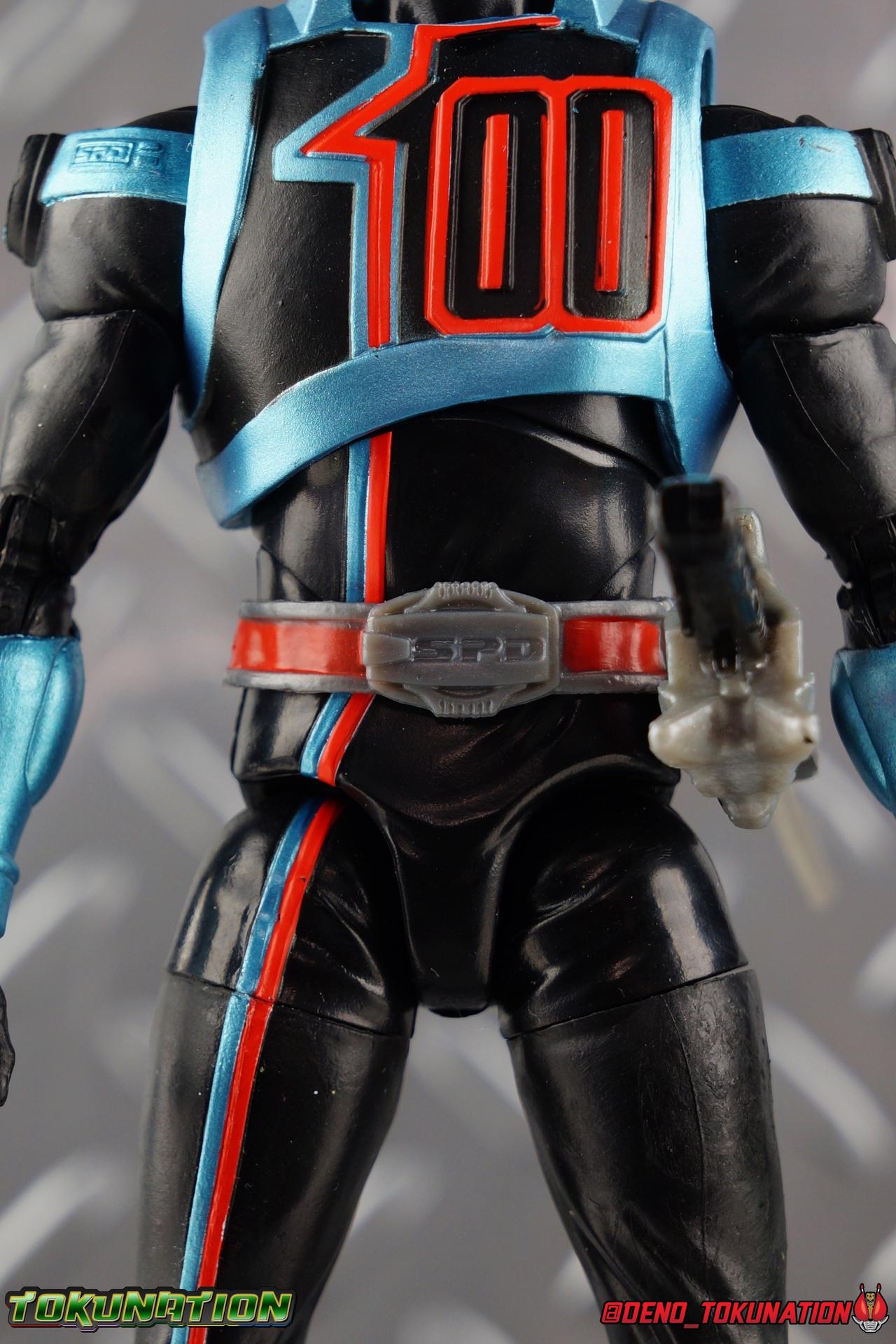 The upper body is designed in basically the same way as White Ranger. The waist does of course have a nice S.P.D. buckle as well as a hip holster for the included