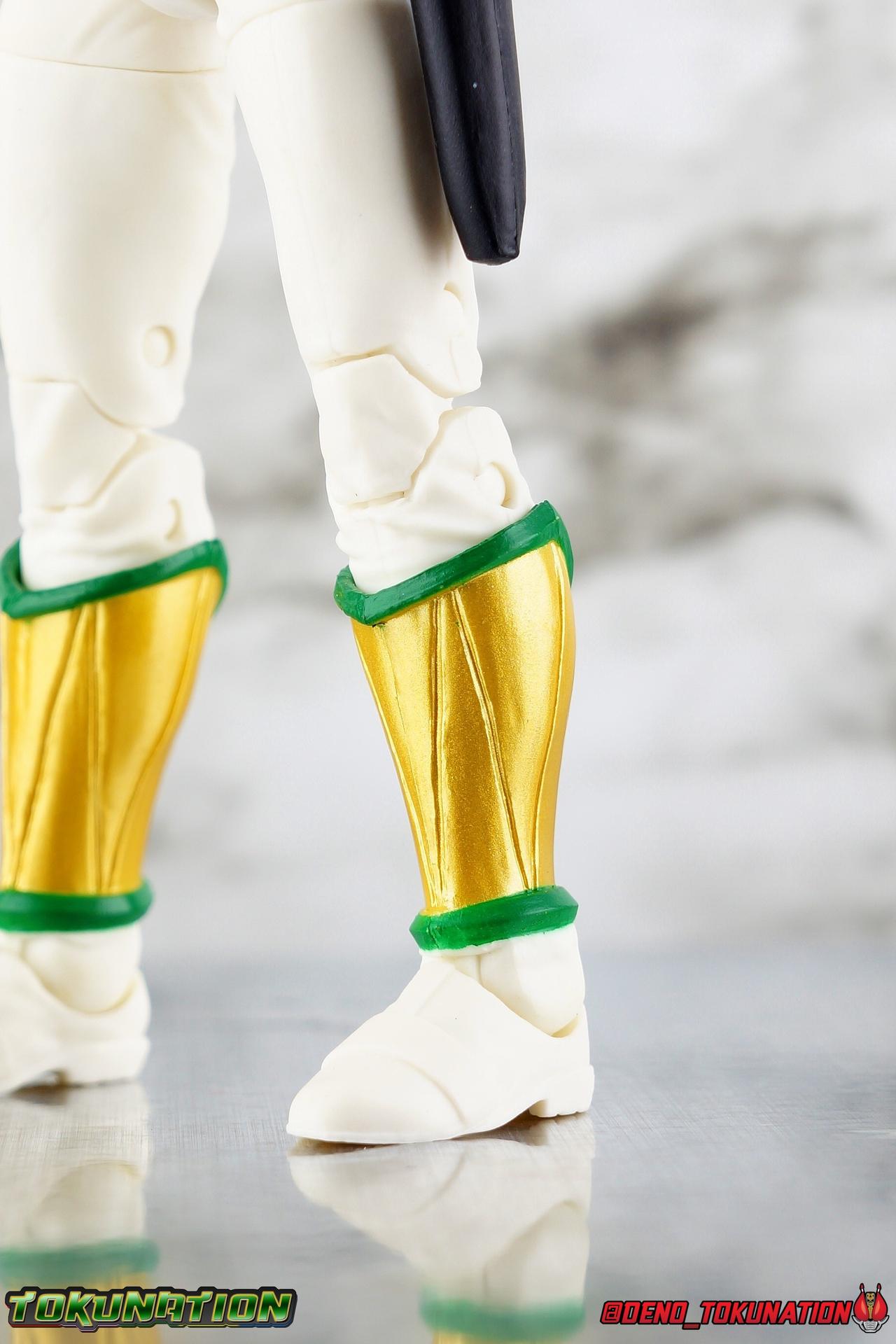 The entire core body is the White Ranger save for a few parts. This is a really good thing, as I still feel that the White Ranger is one of the best body types this line has had to offer up to this point. Lord Drakkon has the same basic swivel/rocker ankles we've come to know but in Drakkon's case you do lose about one click forward on the joint because of the added golden shin armor. There is thankfully still a shin swivel at the top cuff of this armor, allowing you to rotate that portion of the leg below the knee if you wish. The White Ranger mold's knees give us really good natural looking bends that allow you to bend the leg back up and against the thighs. We still have the same nice tight thigh swivels as well as the hinged hip joints. As always this is a great combination of articulation, giving this figure plenty of personality.