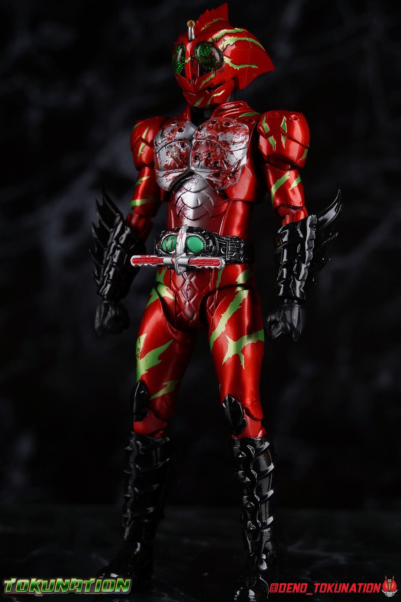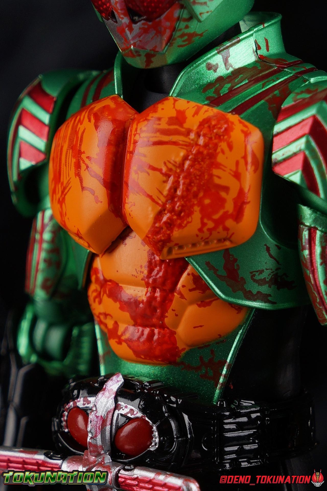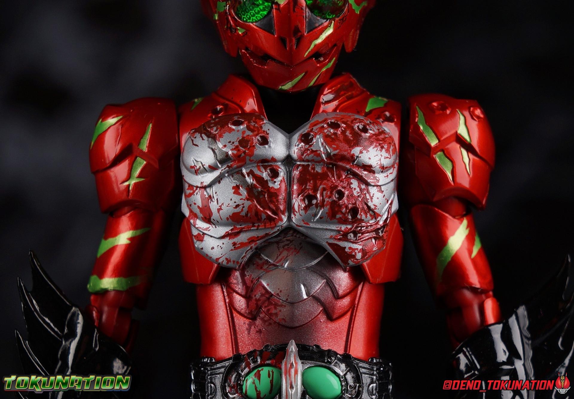 The only thing I'll take a bit of time to really talk about is the lavish new paint applications and slight remolds. Both of these figures are meant to represent Alpha & Omega, right at the end. In the heat of their final battle. Carrying over damage sustained to their human forms, each of them has fresh deep wounds, and blood pouring out. They both feature blood splatter across their limbs, but particularly across their torso and and heads. In particular their torsos are quite gruesome as Alpha features still bleeding bullet holes and Omega features deep scars. These parts are newly molded and are the only physical difference from the original releases of these molds. While that isn't exactly a ton of new stuff to report on, it's worth mentioning just how much care was put into making sure each of these Riders fully represented their final appearances.