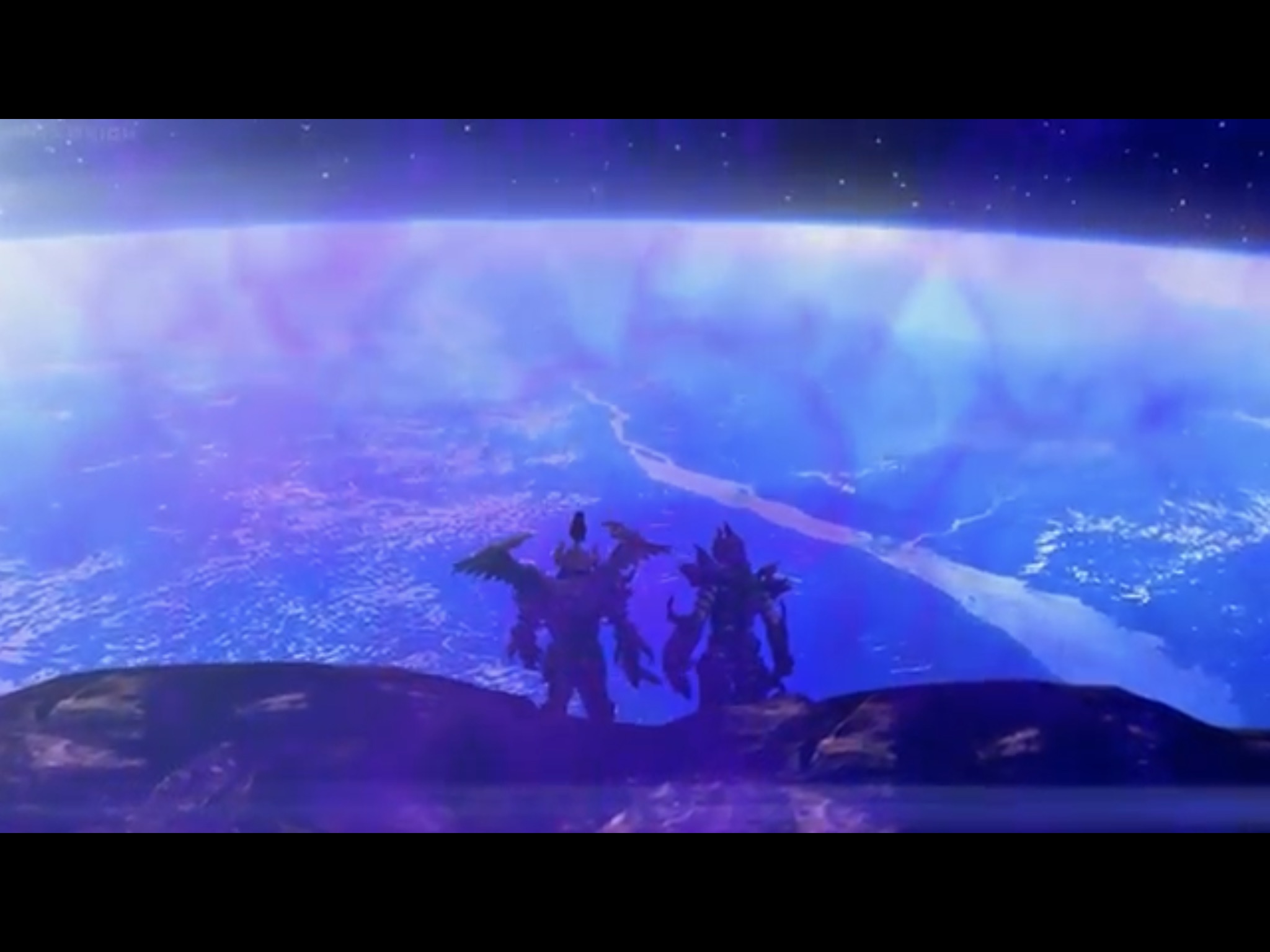 After a series of combo attacks to take out the grunts (such as the three pteranodons, the three triceratops, the sword fighters and the strong ones), we get down to the main battles. First off, as the others go Armed On to take on Enter, Utchy defeats Escape by doing a Brave Finish using Allomerus and Beyonsmo. This causes Enter to evolve into Dark Buster.