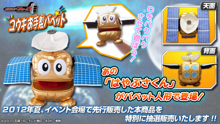 One could claim that it was the 10th member of the Kamen Rider Club, Yuki's trusty puppet Hayabusa-Kun is being given away via a lottery system at a Bandai event, but fret not for those who can't attend the event in person, Bandai is allowing people to purchase a chance to buy a lottery entry via their Bandai premium shop for a chance to own this hand made 1:1 Hayabusa puppet. The lottery costs 2,625 yen per entry, the deadline is Nov. 12th 2012 at 3:00 PM, and the winner will be contacted a week after the deadline. Winner needs to be a Japanese resident unfortunately.