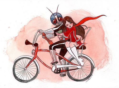 I really like the attached image but I can't find the artist and I'm unsure of context. My other idea was the Goranger red, Ultraman and Kamen Rider Helmets in a row.