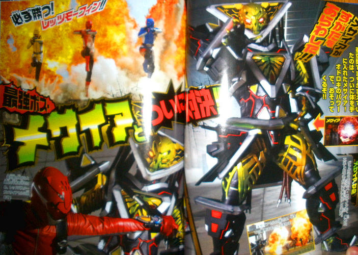 A new batch of TV magazine scans have surfaced revealing a number of things from forthcoming episodes of Tokumei Sentai Go-Busters! Included in the scans are the crossover episodes from Gavan Type-G, the evolved form of Messiah - known as Messiah Cell, and a megazord showdown in hyperspace involving the TV debut of the Epsilon type megazord - Enter's personal mecha first seen in the recent "Protect the Tokyo Enetower!" movie. Also included is a teaser for the upgrade Go-Buster Powered Custom form, which is set to appear around October.