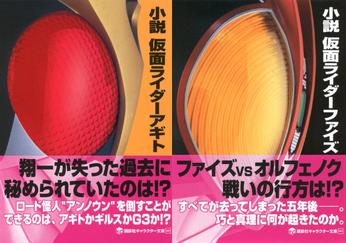The Kamen Rider Agito novel, written by Inoue and Naohiro Okamura, is a retelling of the series plot, including major scenes from the show as well as new plot. The synopsis on the back of the book says: Quote: