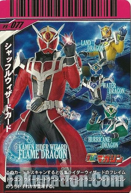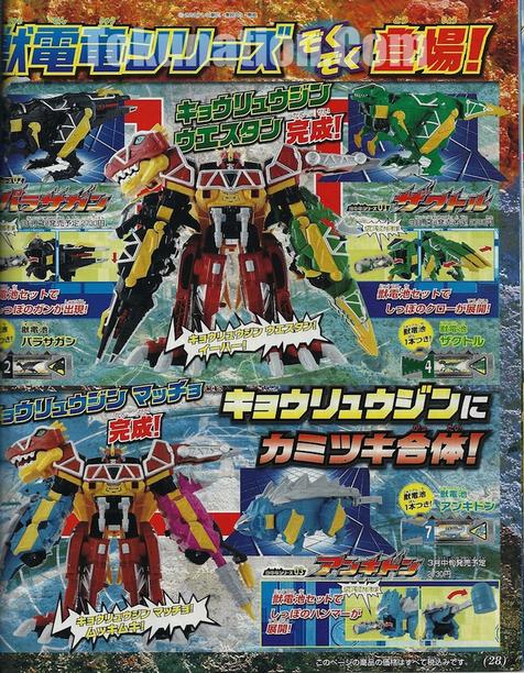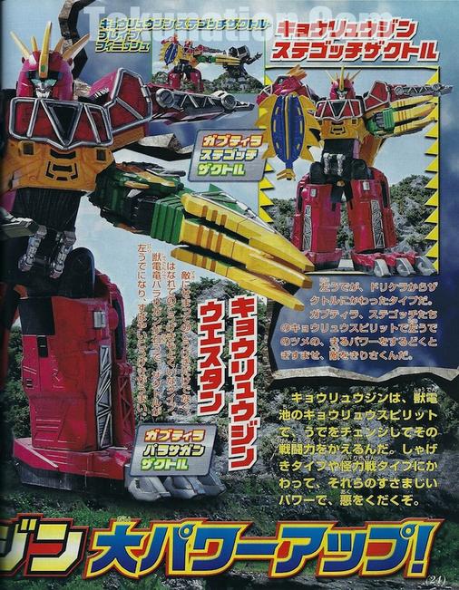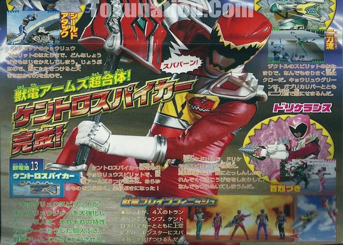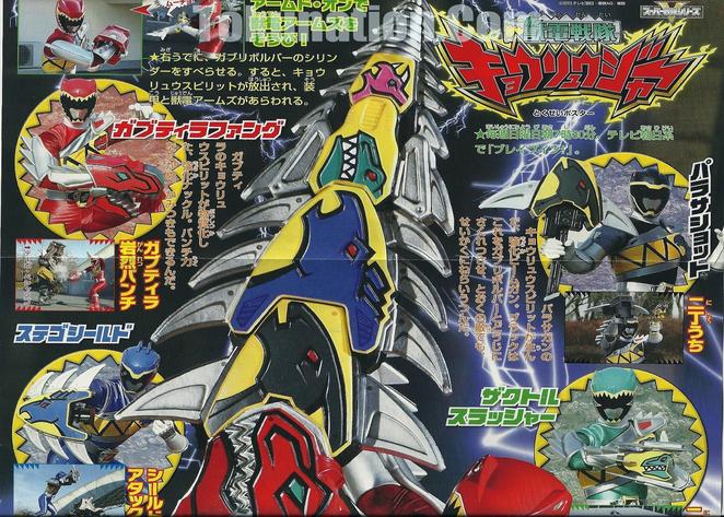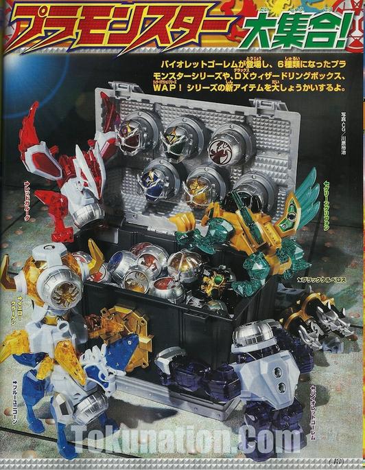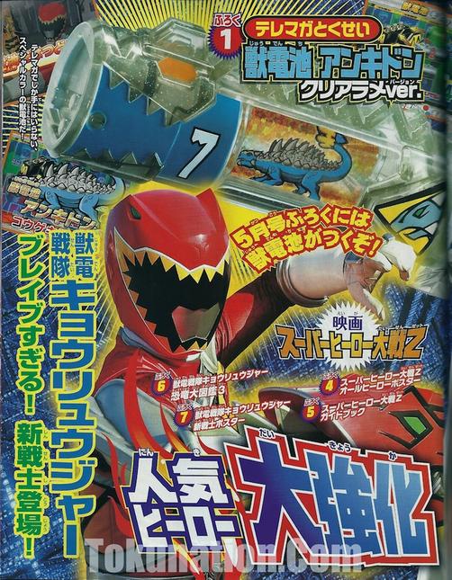 Scans reveal that the Zyudenchi can bestow other powers to the Kyoryuger! Examples include #15 Allomerus, which allows the user to launch a stream of fire from the Gaburevolver and #13 Kentrospiker, which allows the Gaburevolver to launch needle shots! Also seen are more images of Beast Hyper, Super Hero Taisen Z, and several toys, such as the DX DeinoChaser and KyoryuRed Set, and the first clear image of the PlaMonster, Violet Golem! For those collecting Zyudenchi, the Candy Toy and Gashapon sets are shown! Also the next Candy Toy Wizard Ring Set! Candy Toy Set 1: Gabutyra, Stegochi, Dricera, Allomerus, and Igeranodon. Gashapon Set 1: Gabutyra, Stegochi, Dricera, Stymero, Beyonsmo, and Tuperanda. Candy Toy Wizard Ring Set 7: Excite, Please, Light, Drill, Hibiki, Agito, ZX and Amazon. And if the pictures aren't enough of an incentive to pick up a Televi-Magazine, the bonus along with them make them worth the price! Included in this month's edition is a unique Ganbaride Card of Wizard's Four Dragon Styles, and a clear orange Big Wizard Ring! And judging from the scans, next month's bonus will be a clear Ankyodon Zyudenchi! Check Out The Scans!