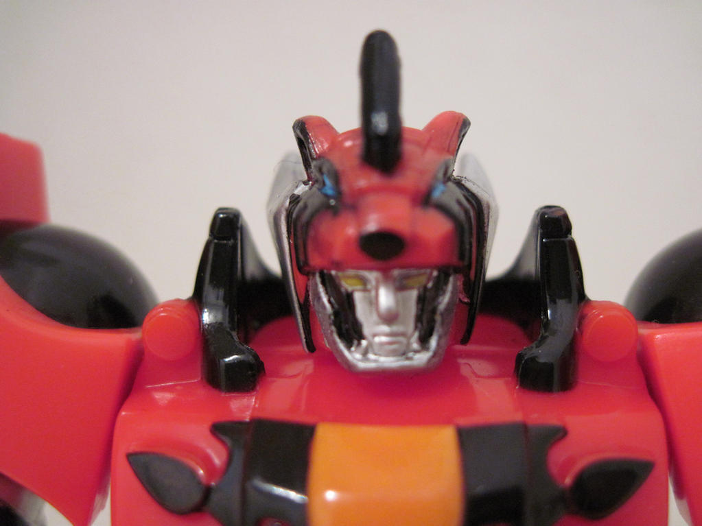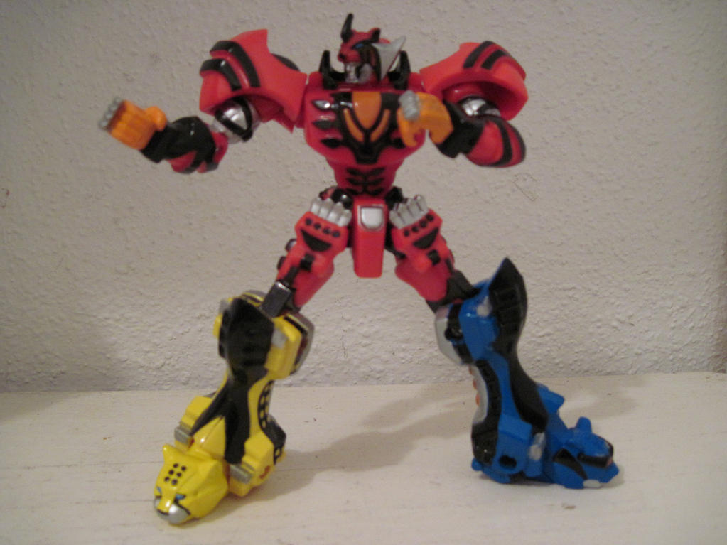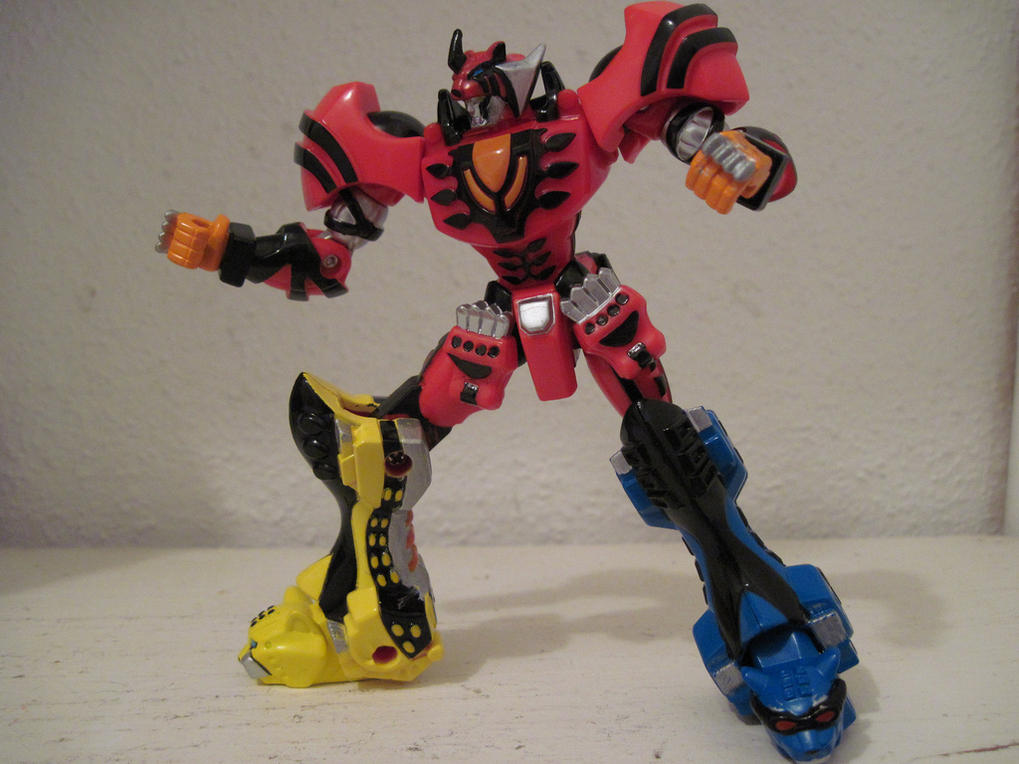 I've been a Super Sentai fan for several years now and I don't have any merchandise from it. The real stuff is a bit too pricey, so I looked to the Power Rangers stuff. I rather liked the idea of the retrofire series. I looked at some reviews and the Jungle Pride megazord seemed to be the best figure currently available. I thought the articulation was pretty cool, totaling 18 points. But the paint scheme seemed too simple. So I added all the details to make it show accurate. I added: - blue paint on the GekiTiger's eyes as well as the black trim around it going up to the ears. - Changed the black on the outside of the face to silver and the bits on the inside to black. - Painted the "rings" on the biceps black - filled the holes on the back of the fists with hot glue and painted orange. - painted the fist claws silver - black paint on the back stripes and back skirt. - black details on the tiger paws at the thighs - black on the thigh and lower thigh - silver on the back of the legs - orange on the leg bumps - black on the back of the legs under the silver - yellow on GekiCheetah's spots - black on GekiCheetah's head spots - silver on the feet of GekiCheetah and GekiJaguar as well as the top of the eyes above the "sunglasses" - black on the cheek stripes of GekiJaguar.