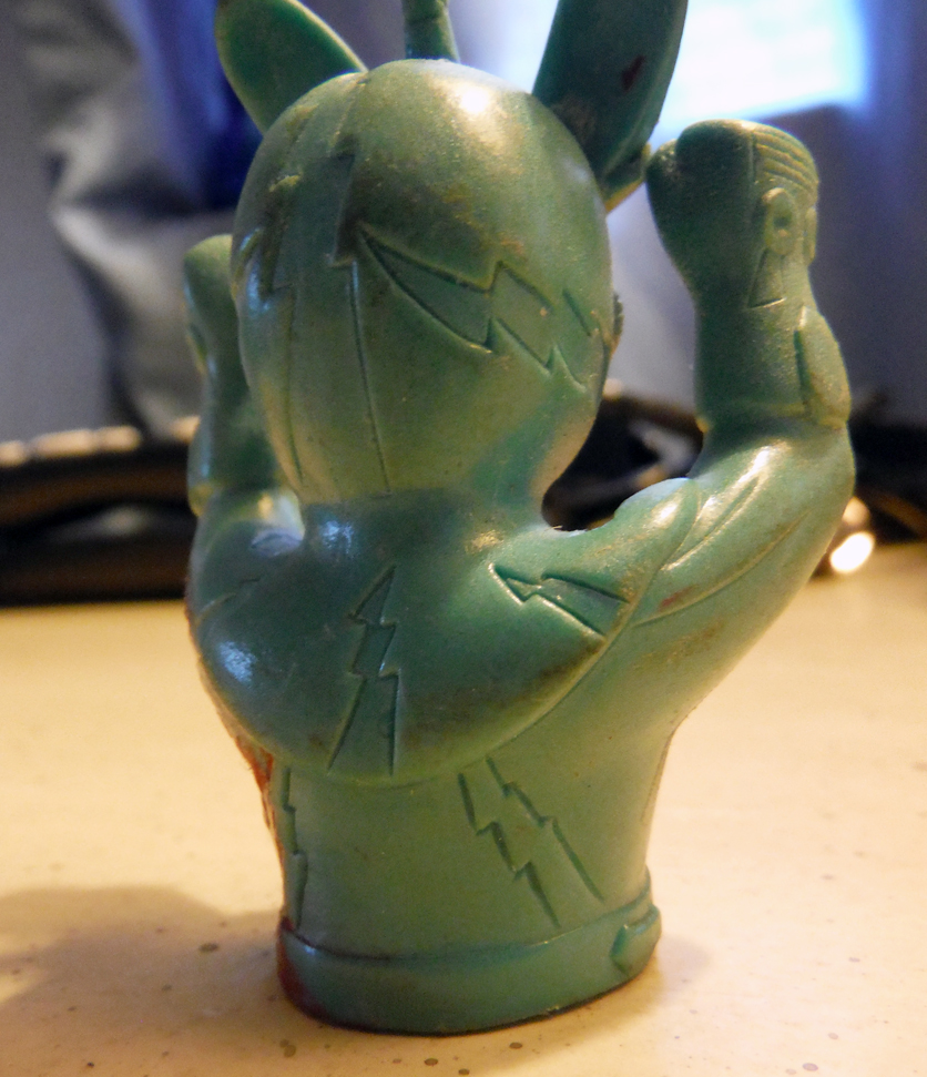 I found this guy at my neighbors, in his box of vintage toys and parts. I've been trying to identify it now and can't :/ I know VERY little about MMPR, so if it's something from MMPR, I'm ignorant of it. Is it something from Ultraman ? Kamen Rider ? Astro-Mu 5 ? I'm guessing here, I've Googled and Googled and got nothing. It is a finger puppet, and has no markings anywhere on it, most likely from the 80's. He's light blue in color, with green eyes. Please see pics. Thanks in advance for any help