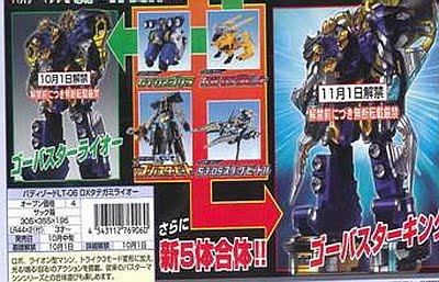 LT-06 can also combine with GT-02 Gorilla and RH-03 Rabbit to form Go-BusterRaiOh! Adding BC-04 Beetle and SJ-05 Stag into the mix forms Go-BusterKing. The question is where does this leave CB-01 Cheetah? Check out the images and discuss after the jump! EDIT- New image shows exactly where CB-01 fits into the configuration! ![]() Source: JEFusion Want Tokunation.com updates on the go? "Like" us on Facebook and follow us @tokunation on Twitter!!